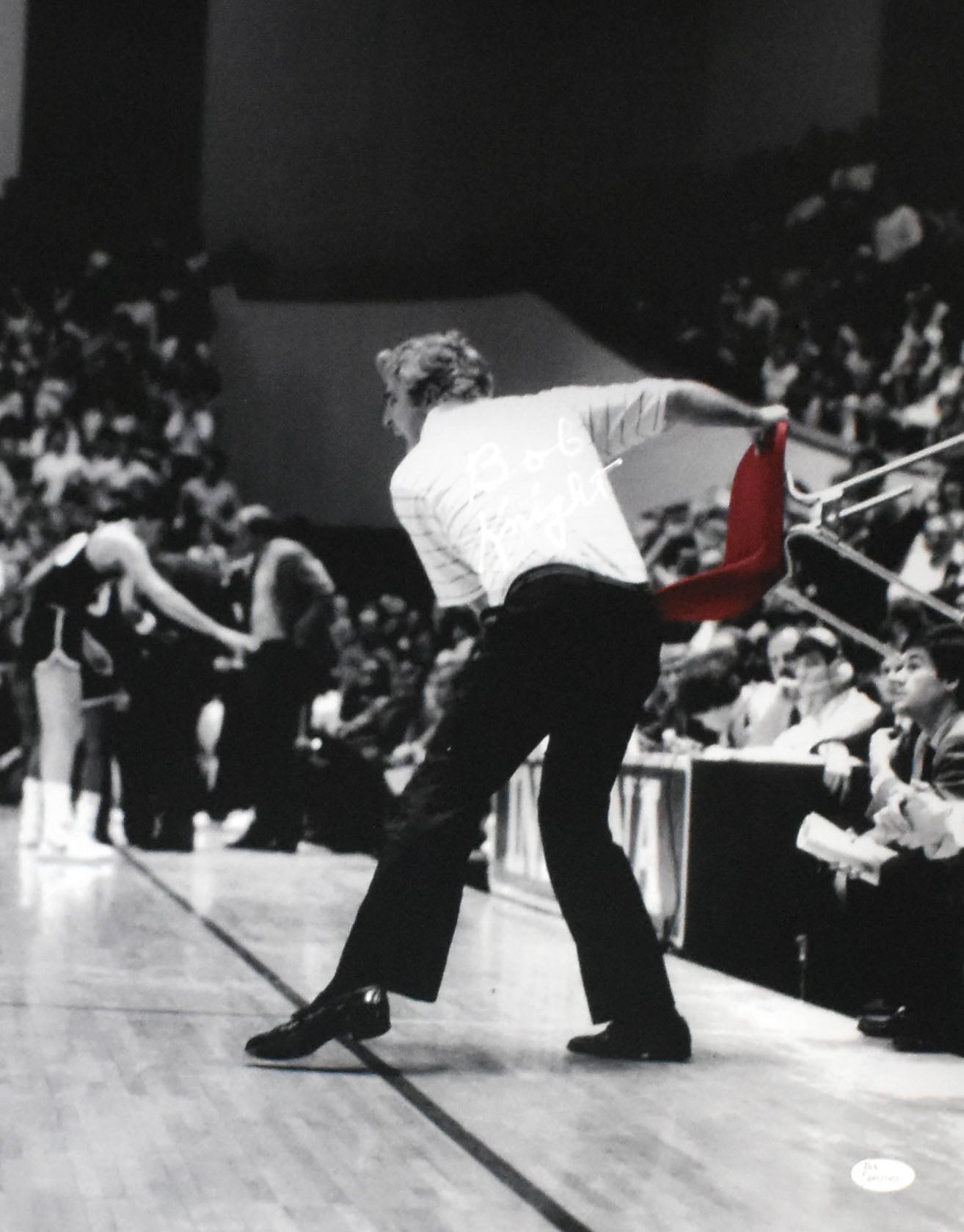 *Vertical* This is a Bob Knight of the Indiana Hoosiers hand autographed 16x20 photo. This item has a James Spence Witnessed Authentication, which comes with a numbered hologram and a JSA COA. You can view this item on the JSA website, it shows when and where the item was signed. It was signed either at a public autograph appearance or a private signing. This is a stock photo of the item. Although you may not receive this exact item, the item you receive is virtually identical, brand new, and in great shape.