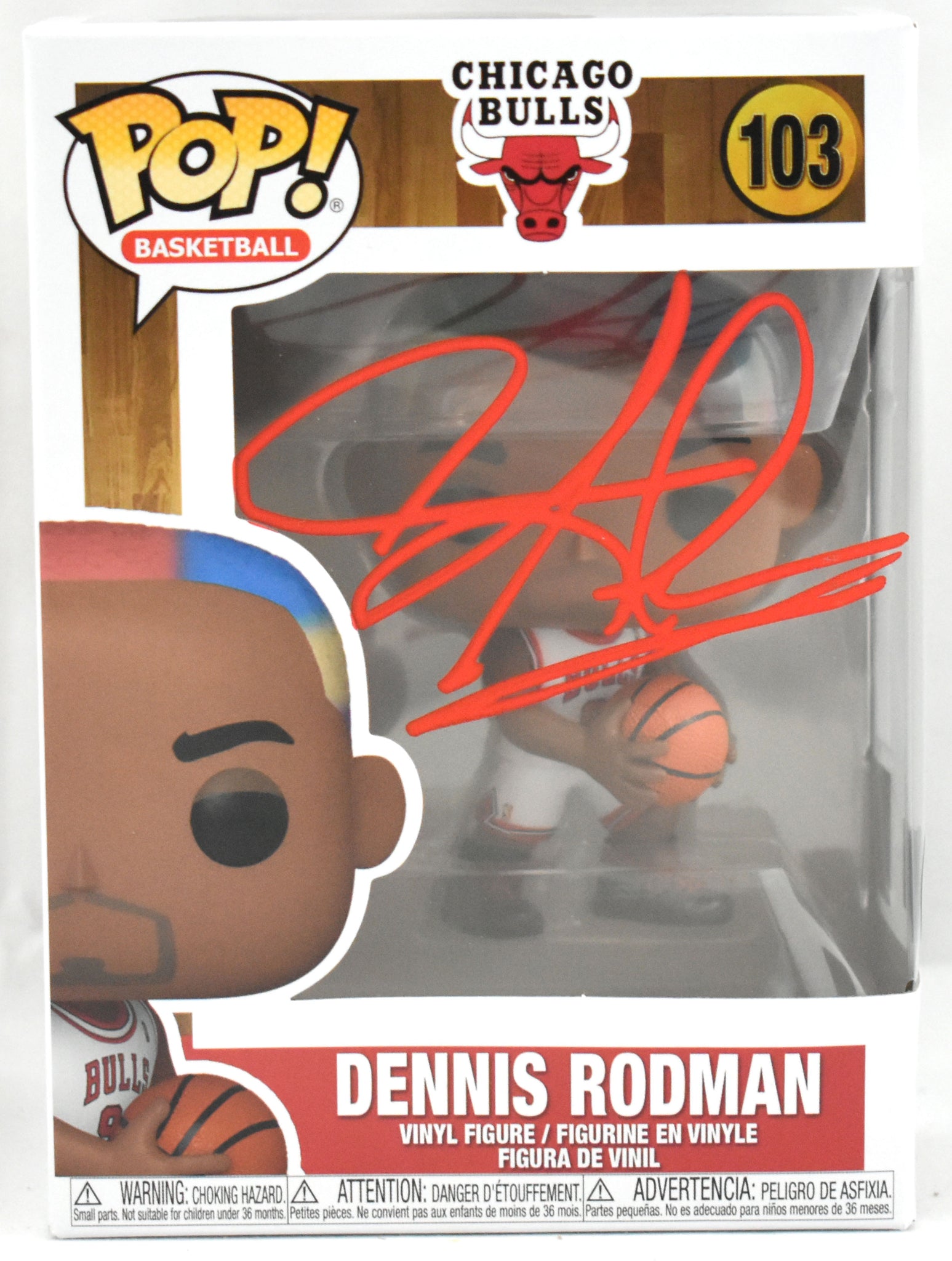 This is a hand autograph of Dennis Rodman of the Chicago Bulls on a Funko Pop Figurine, #103. This item has a Beckett Witnessed Authentication, which comes with a numbered hologram and a QR code for verification. You can view this item on the Beckett Authentication website. It was signed either at a public autograph appearance or a private signing. This is a stock photo of the item. Although you may not receive this exact item, the item you receive is virtually identical and brand new in great shape.