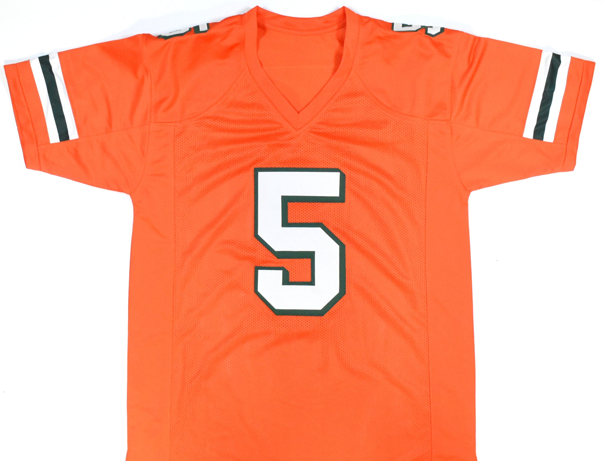 THIS IS NOT AN NCAA JERSEY. THIS HAS NO TAGS, NO LOGOS, NO EMBLEMS. This is a hand autograph of Edgerrin James of the University of Miami Hurricanes on a Custom made (non-name brand) Authentic Style Jersey with stitched letters and numbers. This item has a Beckett Witnessed Authentication, which comes with a Beckett numbered sticker hologram and a QR Code for verification. You can view this item on the Beckett Authentication website. It was signed either at a public autograph appearance or a private signing. This is a stock photo of the item. Although you may not receive this exact item, the item you receive is virtually identical and brand new in great shape. Jersey size is XL.