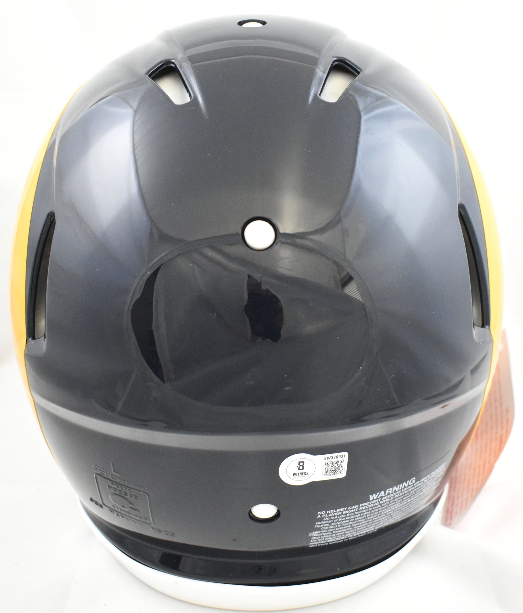 This is an Eric Dickerson of the Los Angeles Rams autographed Riddell football full size 81-99 Speed Authentic helmet. This item has a Beckett Witnessed Authentication, which comes with a numbered hologram and a QR code for verification. You can view this item on the Beckett Authentication website, and it shows when and where the item was signed. It was signed either at a public autograph appearance or a private signing. This is a stock photo of the item. Although you may not receive this exact item, the item you receive is virtually identical, brand new, and in great shape. *Autograph location may vary*