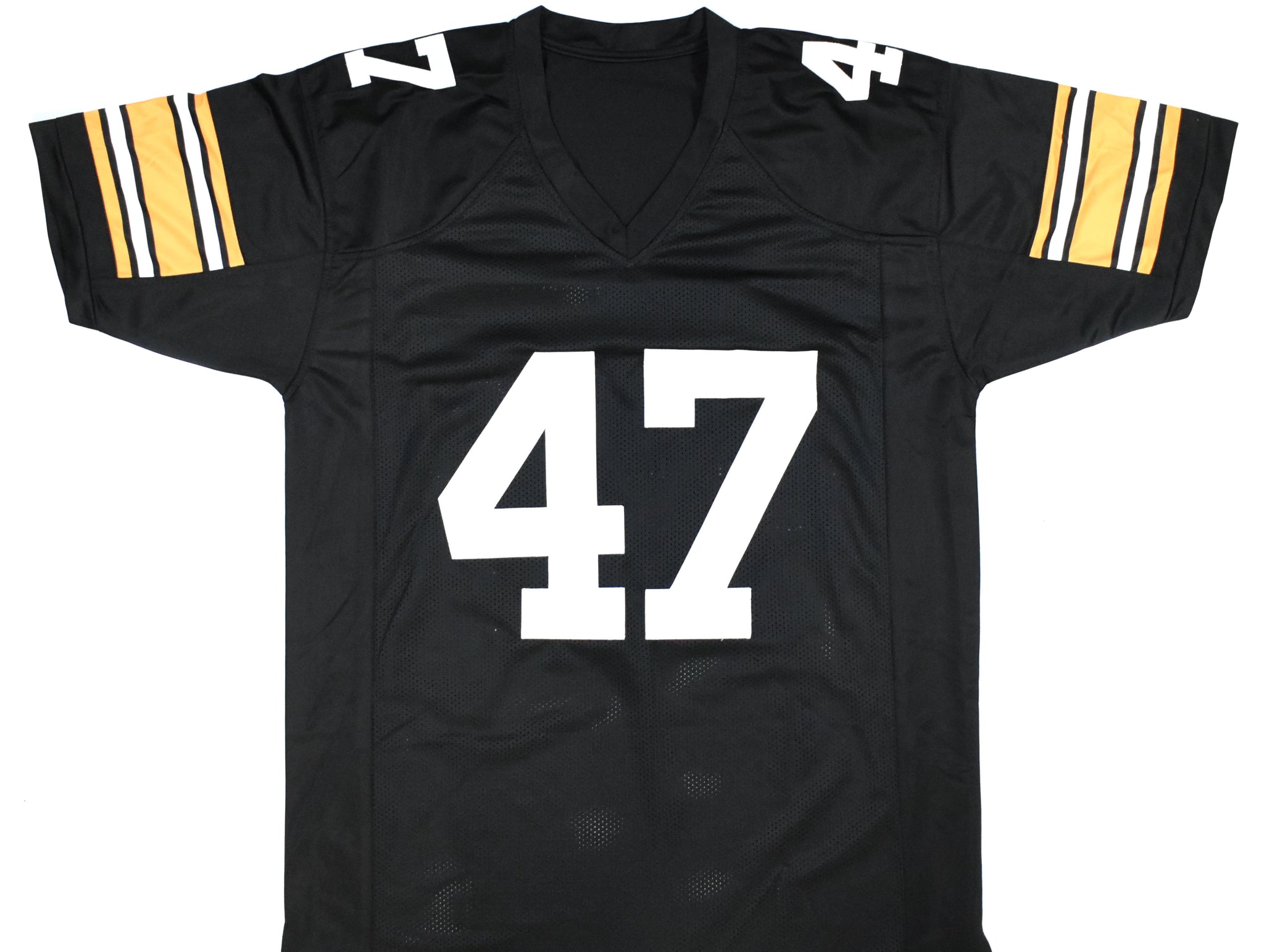 THIS IS NOT AN NFL JERSEY. THIS HAS NO TAGS, NO LOGOS, NO EMBLEMS. This is a hand autograph of Mel Blount of the Pittsburgh Steelers on a Custom made (non-name brand) Authentic Style Jersey with stitched letters and numbers. This item has a Prova Authentication, which comes with a Prova numbered sticker hologram. You can view this item on the Prova Authentication website. It was signed either at a public autograph appearance or a private signing. This is a stock photo of the item. Although you may not receive this exact item, the item you receive is virtually identical and brand new in great shape. Jersey size is XL.
