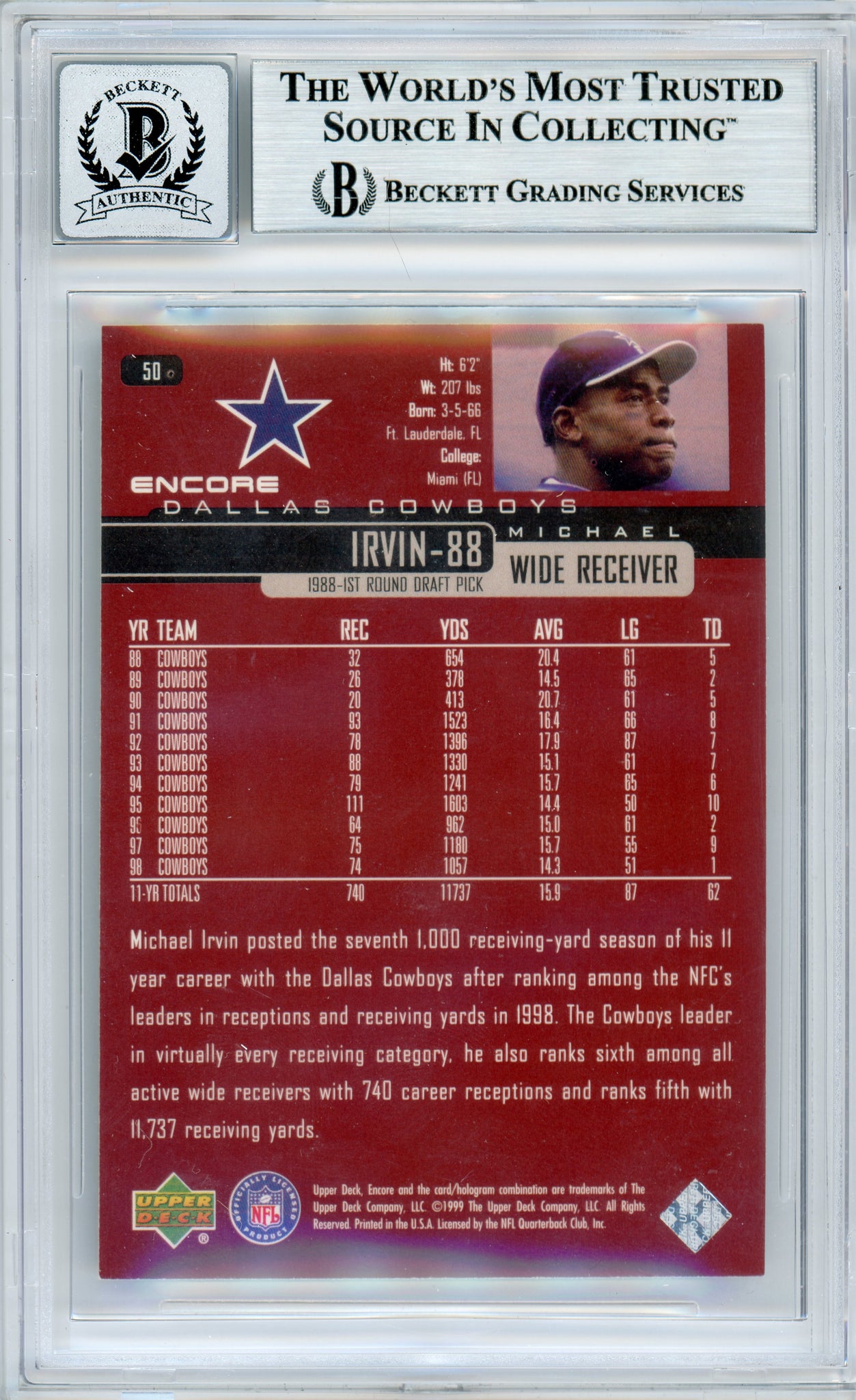 1999 Upper Deck Encore #50 Michael Irvin Dallas Cowboys BGS Autograph 10 sports trading card, hand signed by Michael Irvin and graded by Beckett Grading Services. (BGS) We appreciate your interest in our items, and we hope that we can make all transactions professional and satisfying.