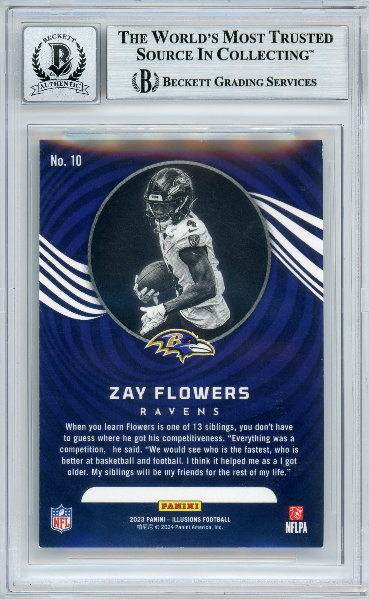 2023 Panini Illusions Emerald #10 Zay Flowers RC Ravens BGS Autograph 10 sports trading card, hand signed by Zay Flowers of the Baltimore Ravens. This item is graded by Beckett Grading Services. (BGS) Visit the Beckett website and enter the certification code provided on slab for more information about this item. We appreciate your interest in our items, and we hope to provide you with a smooth and professional transaction.