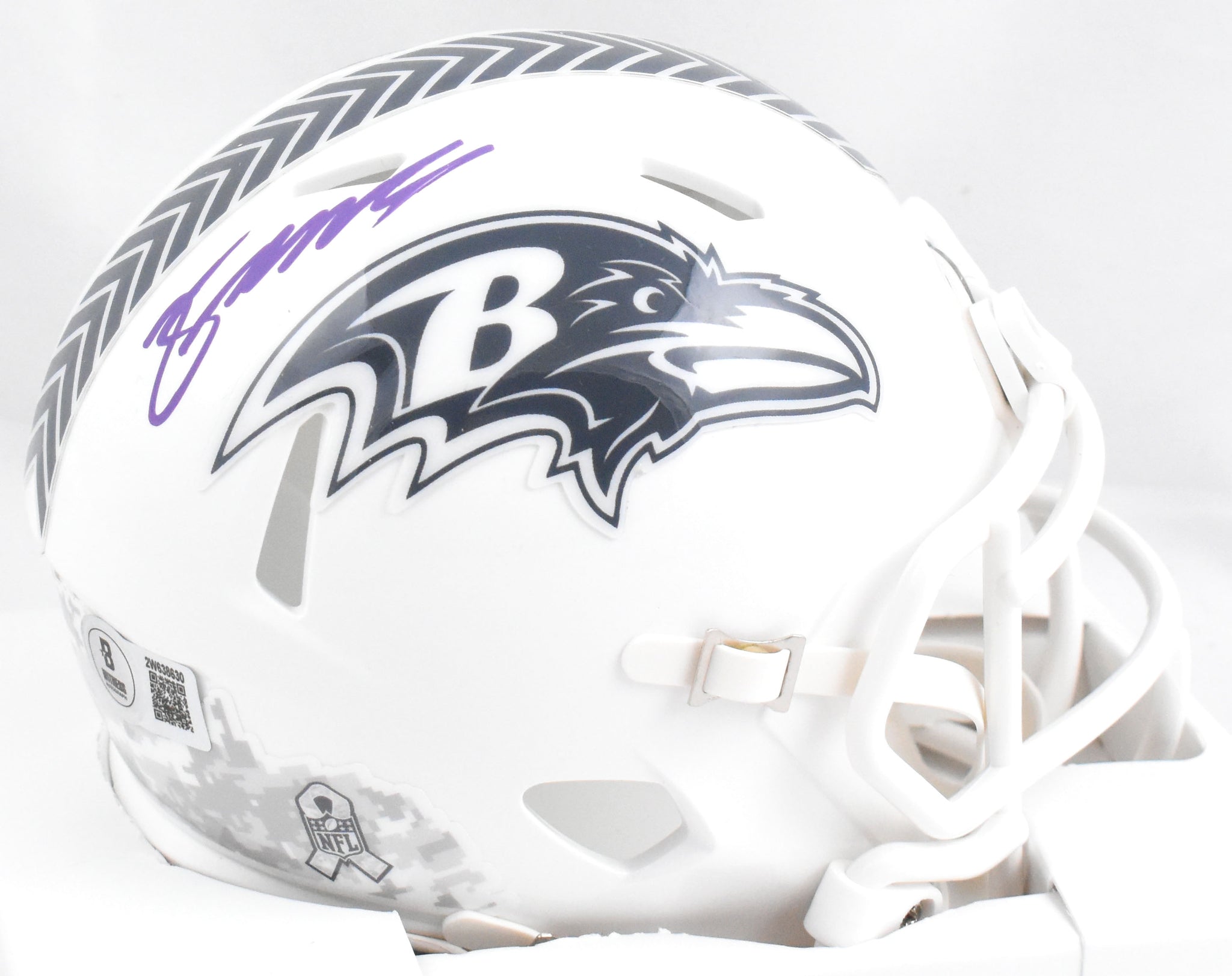 This is a hand autograph of Zay Flowers of the Baltimore Ravens on a Riddell Football Salute to Service 2024 Speed Mini Helmet. This item has a Beckett Witnessed Authentication, which comes with a numbered hologram and a QR code for verification. You can view this item on the Beckett Authentication website and it shows when and where the item was signed. It was signed either at a public autograph appearance or a private signing. This is a stock photo of the item. Although you may not receive this exact item, the item you receive is virtually identical and brand new in great shape.