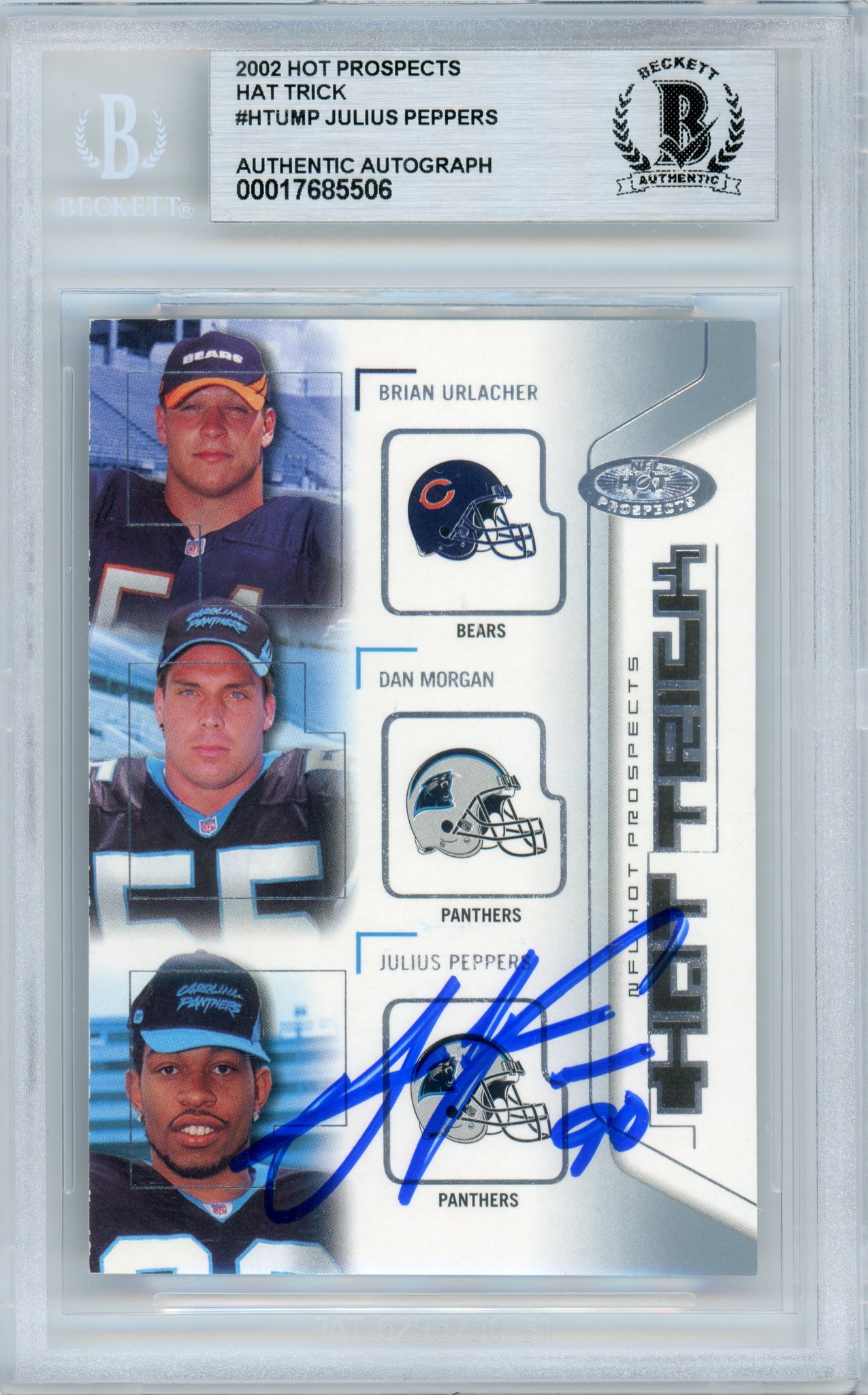 2002 Hot Prospects Hat Trick #HTUMP Julius Peppers RC Panthers BGS Autograph sports trading card, hand signed by Julius Peppers of the Carolina Panthers. This item is graded by Beckett Grading Services. (BGS) Visit the Beckett website and enter the certification code provided on slab for more information about this item. We appreciate your interest in our items, and we hope to provide you with a smooth and professional transaction.