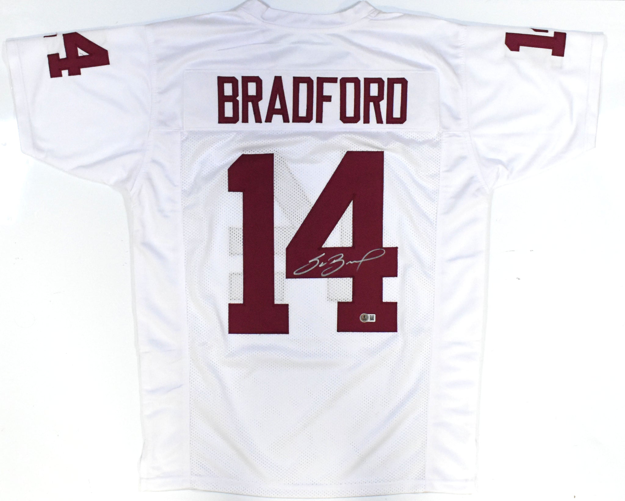 THIS IS NOT AN NCAA JERSEY. THIS HAS NO TAGS, NO LOGOS, NO EMBLEMS. This is a hand autograph of Sam Bradford of the Oklahoma Sooners on a Custom made (non-name brand) Authentic Style Jersey with stitched letters and numbers. This item has a Beckett Witnessed Authentication, which comes with a Beckett numbered sticker hologram and a QR Code for verification. You can view this item on the Beckett Authentication website. It was signed either at a public autograph appearance or a private signing. This is a stock photo of the item. Although you may not receive this exact item, the item you receive is virtually identical and brand new in great shape. Jersey size is XL.