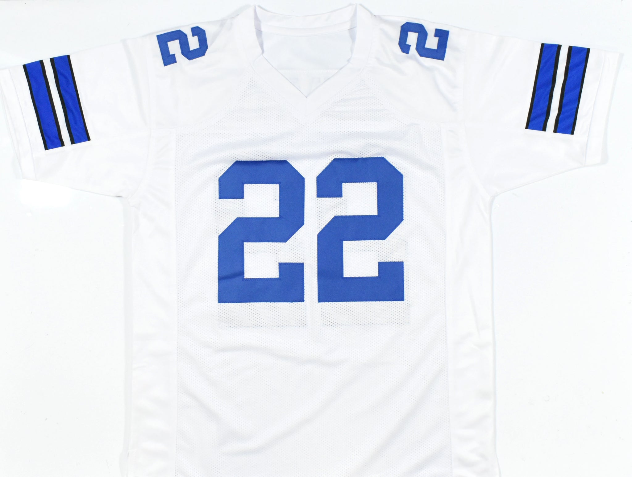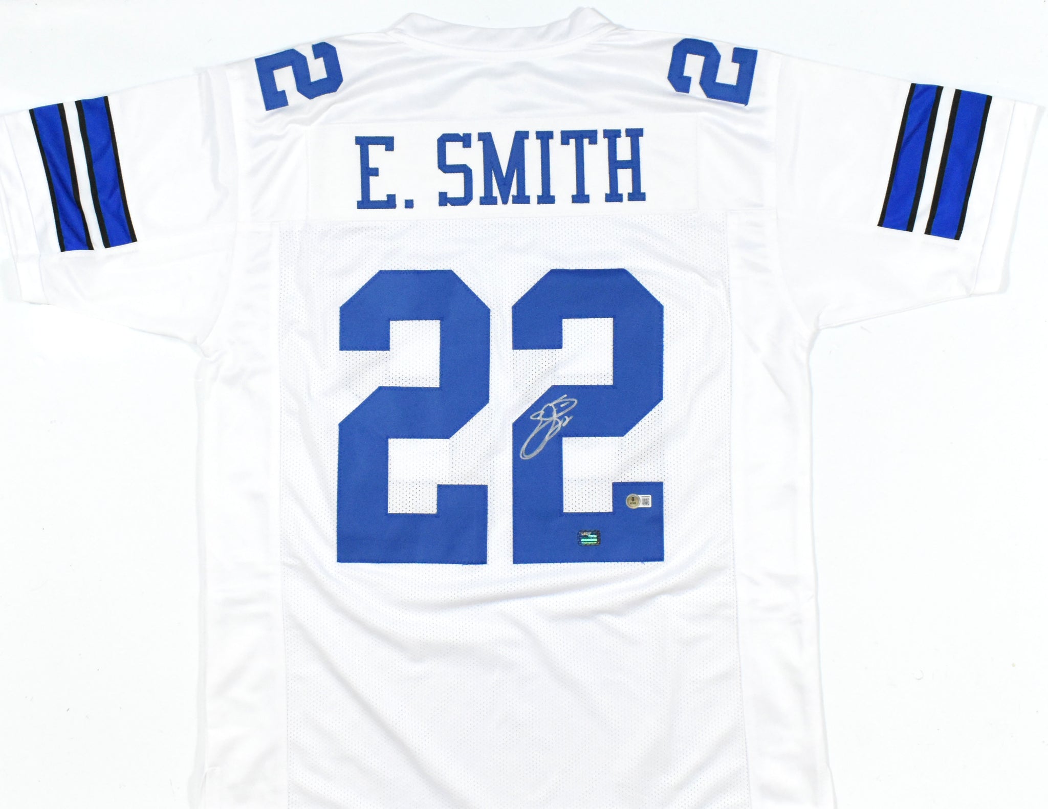 THIS IS NOT AN NFL JERSEY. THIS HAS NO TAGS, NO LOGOS, NO EMBLEMS. This is an Emmitt Smith hand autographed custom made (Non Name Brand) authentic style jersey with stitched letters and numbers. This item has a Beckett Witnessed Authentication, which comes with a Beckett numbered hologram and a generic Certificate of Authenticity. You can view this item on the Beckett Authentication website, it shows when and where the item was signed. It was signed either at a public autograph appearance or a private signing. This is a stock photo of the item. Although you may not receive this exact item, the item you receive is virtually identical, brand new, and in great shape. Jersey size is XL.