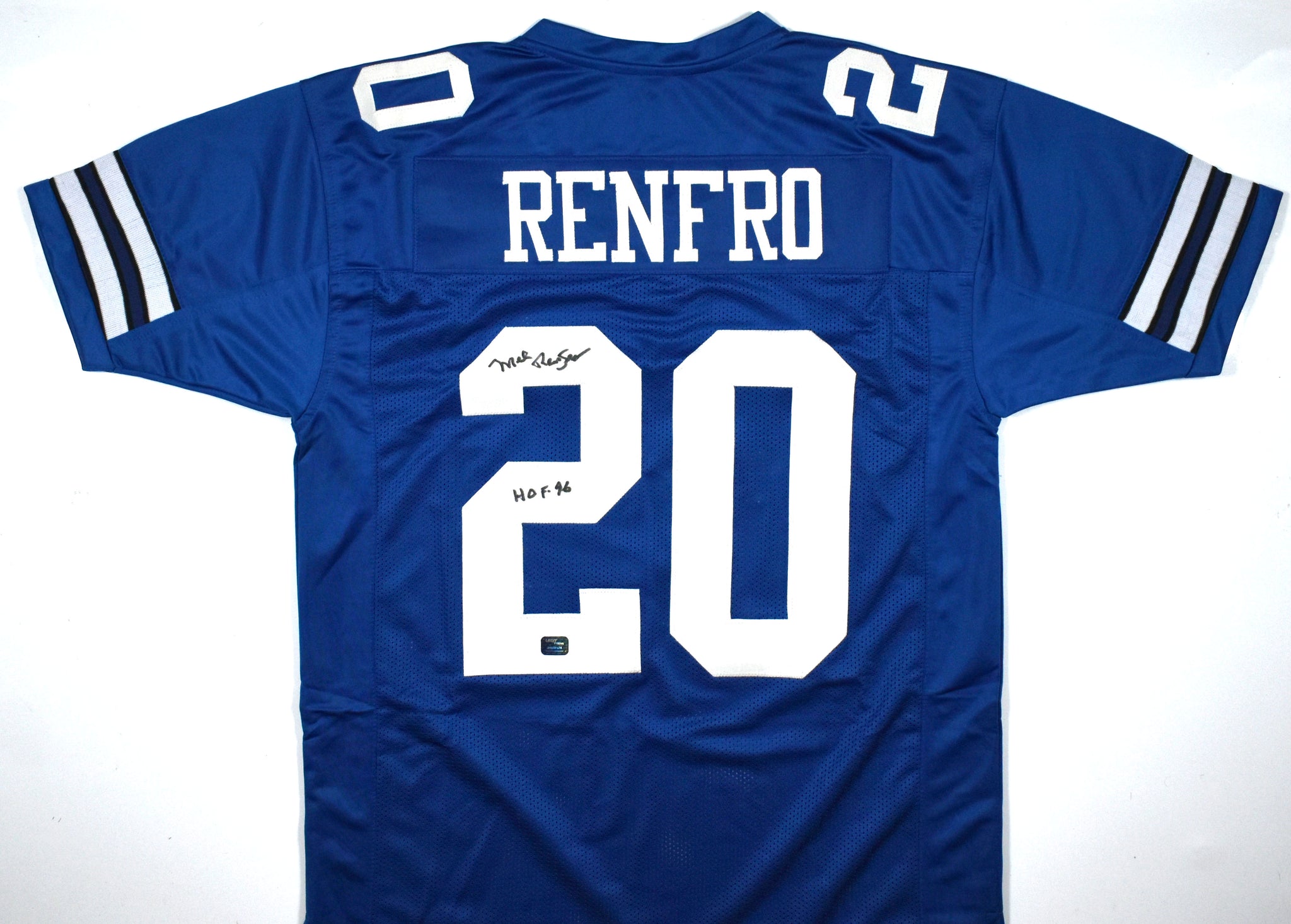 THIS IS NOT AN NFL JERSEY. THIS HAS NO TAGS, NO LOGOS, NO EMBLEMS. This is a hand autograph of Mel Renfro on a Custom Made (non name brand) Authentic Style Jersey with stitched letters and numbers. Inscribed HOF. This item has a Prova Authentication, which comes with a Prova numbered sticker hologram. You can view this item on the Prova Authentication website and it shows when and where the item was signed. It was signed either at a public autograph appearance or a private signing. This is a stock photo of the item. Although you may not receive this exact item, the item you receive is virtually identical and brand new in great shape. Jersey size is XL.