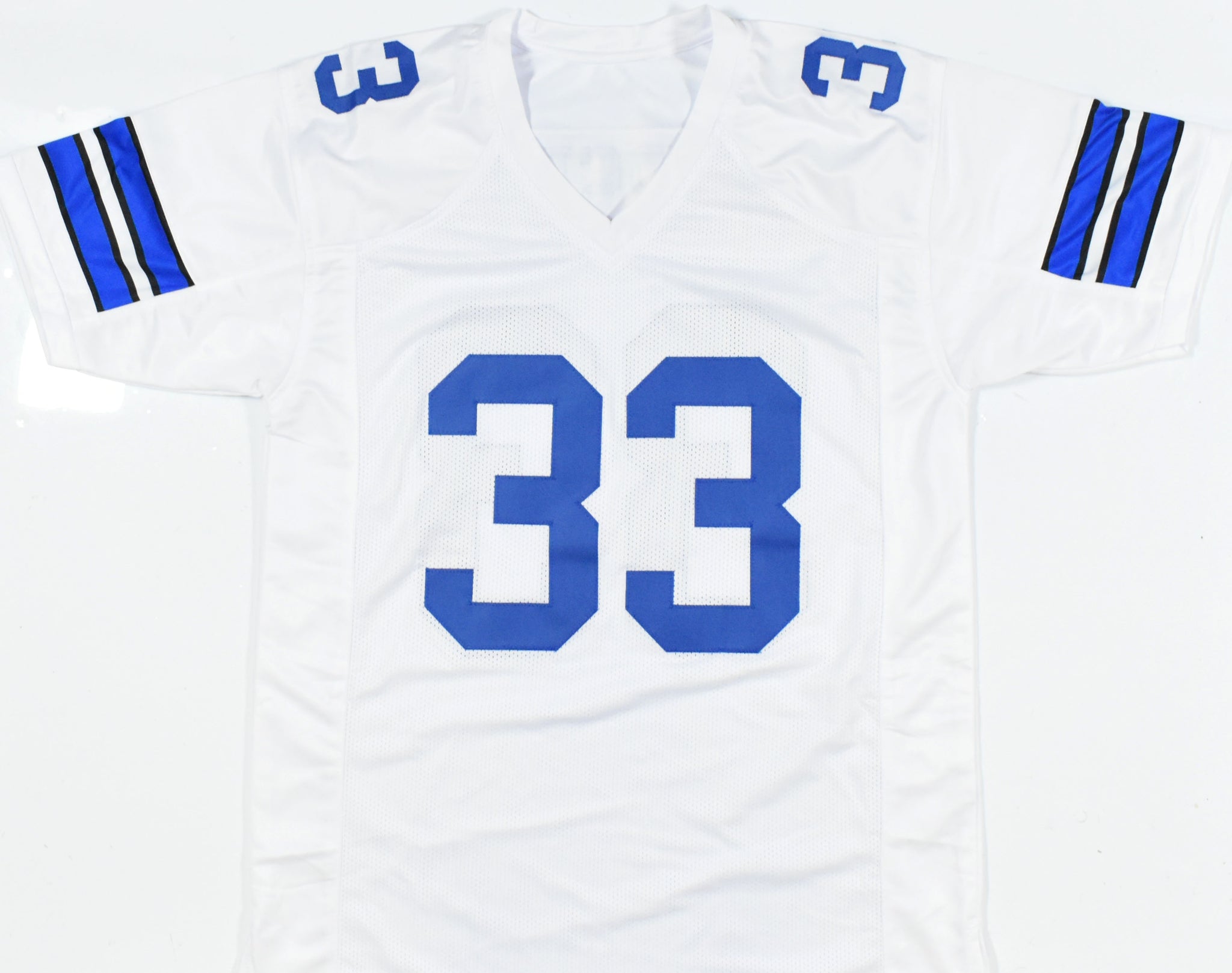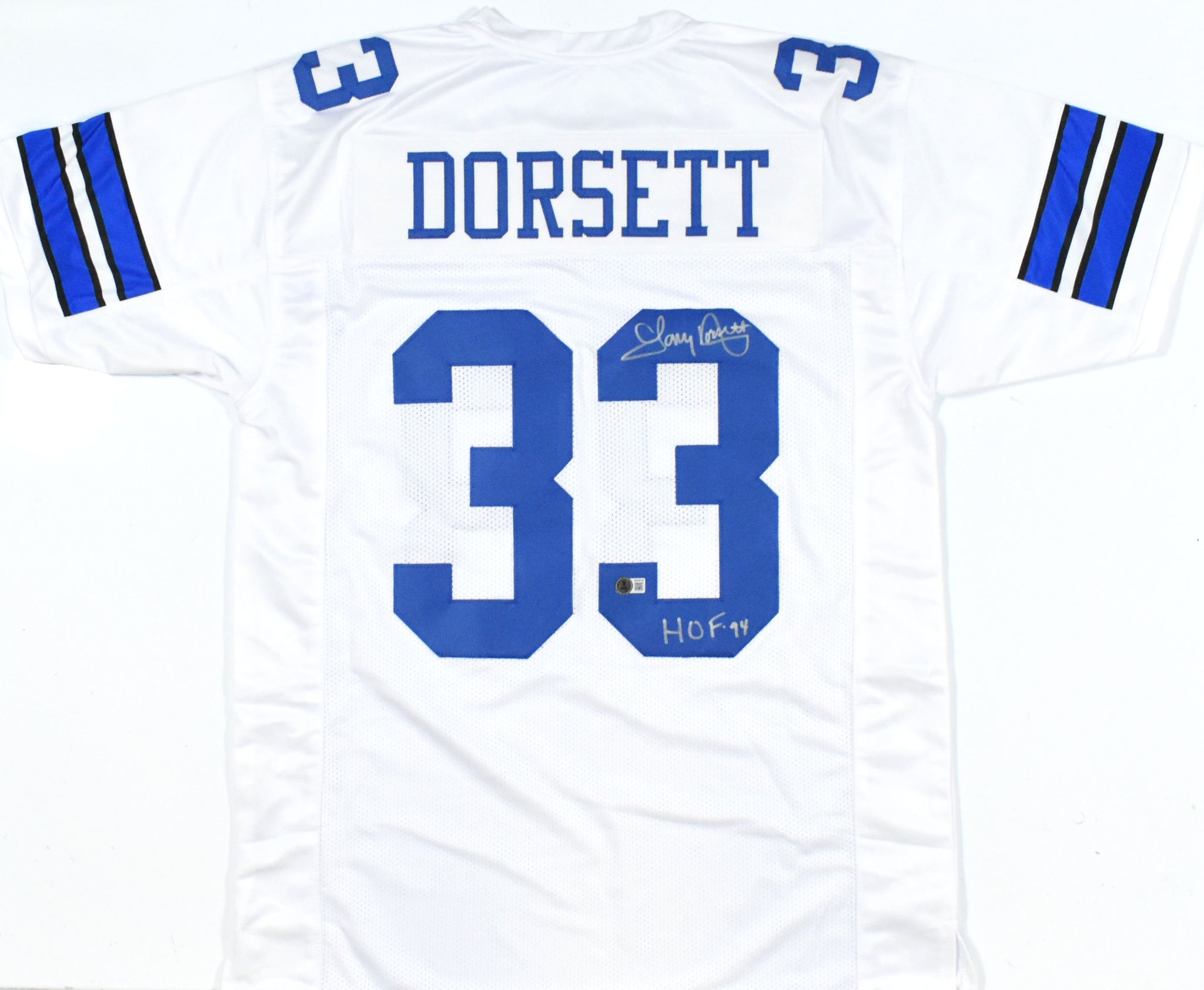 THIS IS NOT AN NFL JERSEY. THIS HAS NO TAGS, NO LOGOS, NO EMBLEMS. This is a hand autograph of Tony Dorsett of the Dallas Cowboys on a Custom Made (non-name brand) Authentic Style Jersey with stitched letters and numbers. Inscribed HOF. This item has a Beckett Witnessed Authentication, which comes with a Beckett numbered sticker hologram and a QR Code for verification. You can view this item on the Beckett Authentication website. It was signed either at a public autograph appearance or a private signing. This is a stock photo of the item. Although you may not receive this exact item, the item you receive is virtually identical and brand new in great shape. Jersey size is XL.