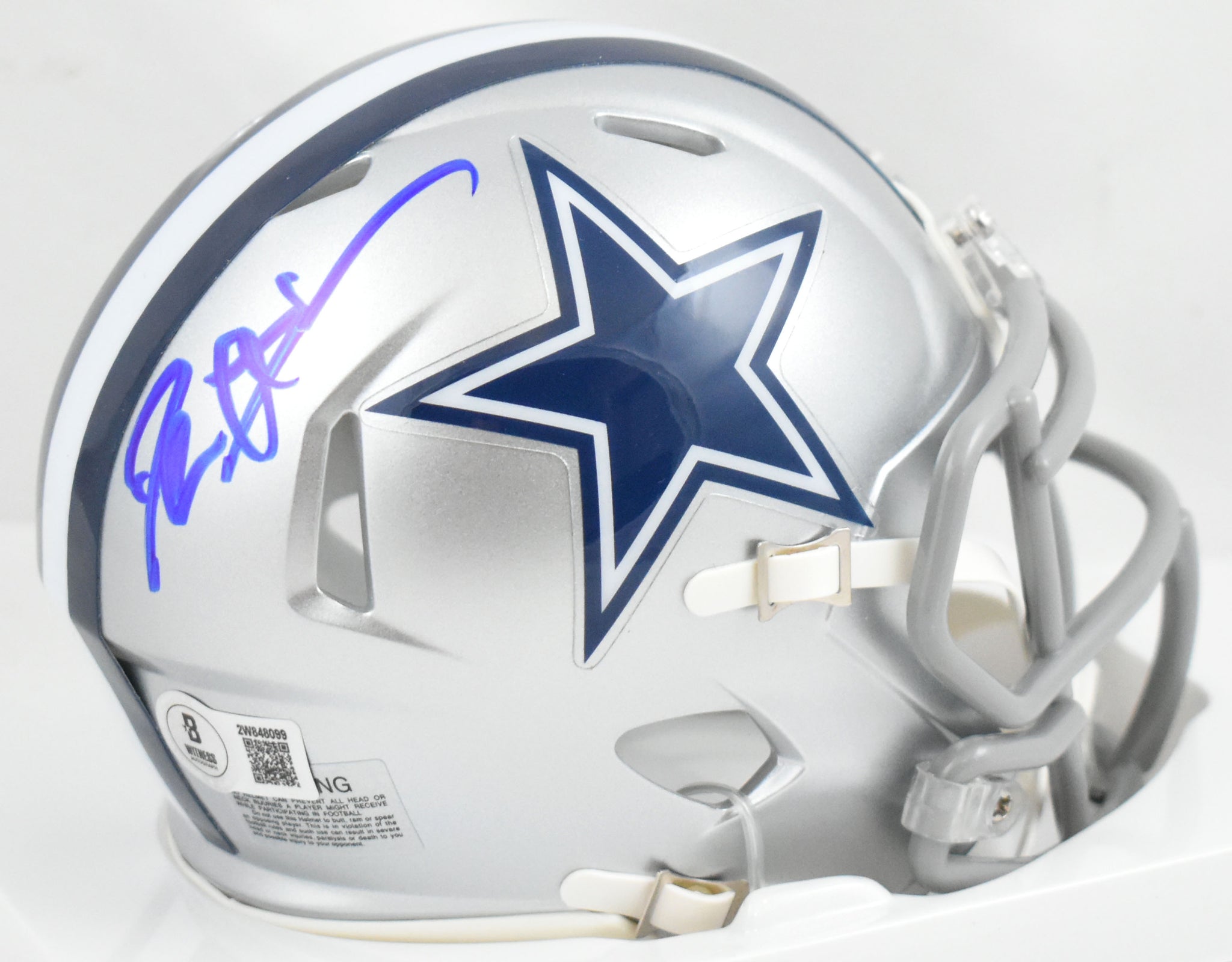 This is a hand autograph of Deion Sanders of the Dallas Cowboys on a Riddell Football Speed Mini Helmet. This item has a Beckett Witnessed Authentication, which comes with a numbered hologram and a QR code for verification. You can view this item on the Beckett Authentication website, and it shows when and where the item was signed. It was signed either at a public autograph appearance or a private signing. This is a stock photo of the item. Although you may not receive this exact item, the item you receive is virtually identical and brand new in great shape.