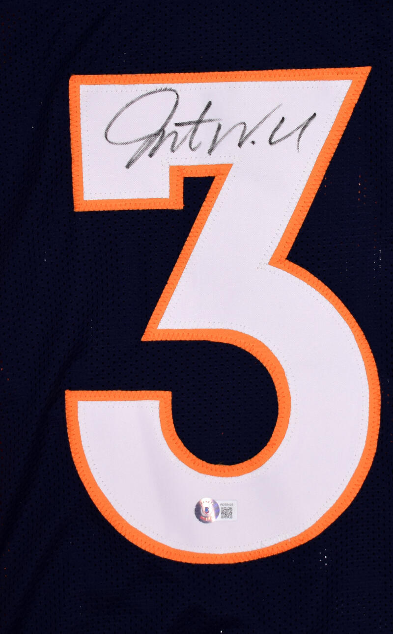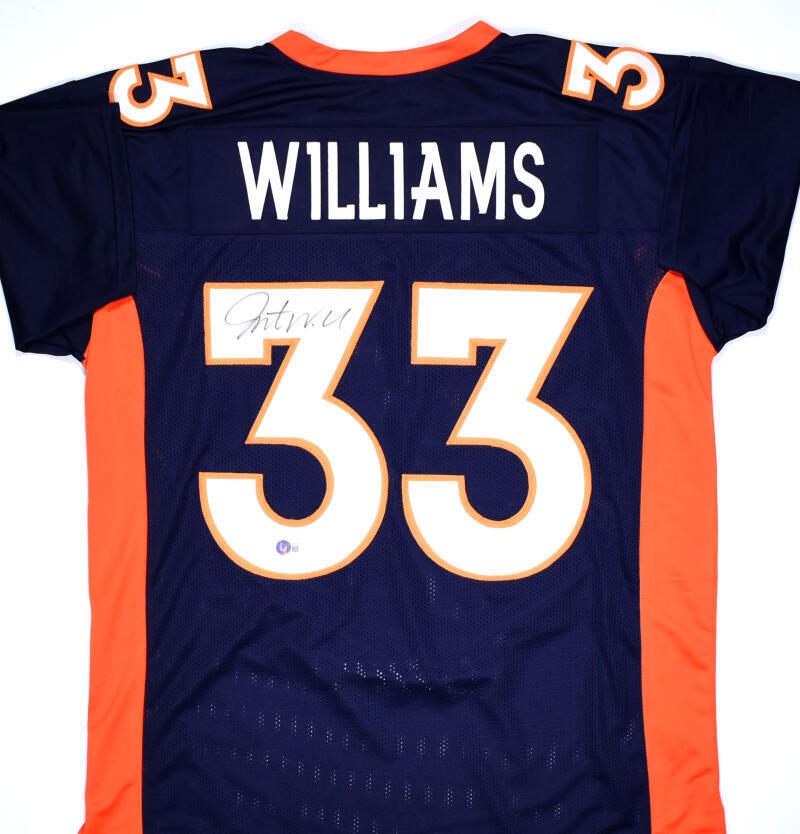 THIS IS NOT AN NFL JERSEY. THIS HAS NO TAGS, NO LOGOS, NO EMBLEMS. This is a hand autograph of Javonte Williams on a custom (Non Name Brand) Authentic style Jersey with stitched letters and numbers. This item has a Beckett Witnessed Authentication, which comes with a Beckett numbered hologram and a QR code for verification. You can view this item on the Beckett Authentication website and it shows when and where the item was signed. It was signed either at a public autograph appearance or a private signing. This is a stock photo of the item. Although you may not receive this exact item, the item you receive is virtually identical and brand new in great shape. Jersey size is XL.