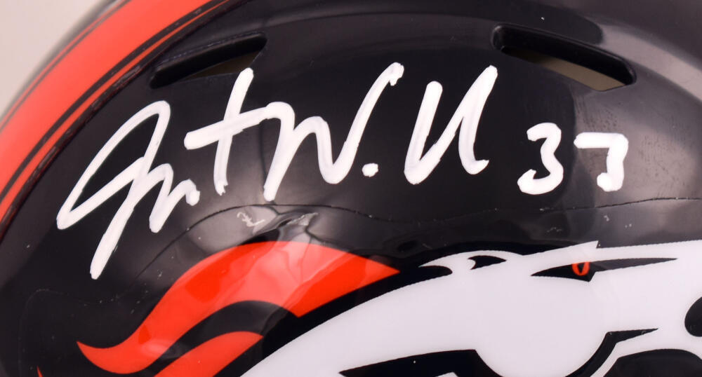 This is a hand autograph of Javonte Williams of the Denver Broncos on a Riddell Football Speed Mini Helmet. It has a Beckett Witnessed Authentication, which comes with a numbered hologram and a QR code for verification. You can view this item on the Beckett Authentication website and it shows when and where the item was signed. It was signed either at a public autograph appearance or a private signing. This is a stock photo of the item. Although you may not receive this exact item, the item you receive is virtually identical and brand new in great shape.