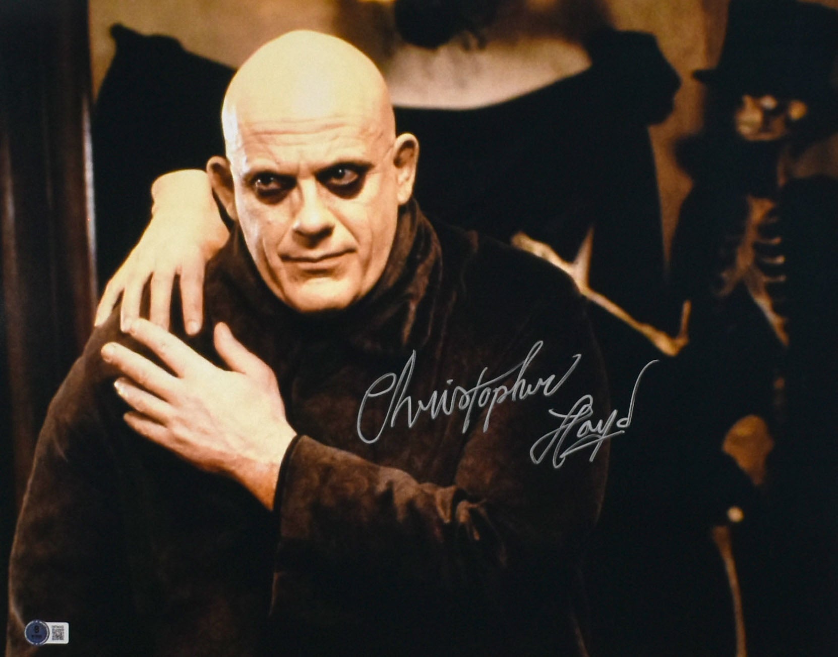 This is a hand autographed 16x20 photo of Christopher Lloyd as Uncle Fester in the movie The Addams Family. This item has a Beckett Witnessed Authentication, which comes with a Beckett numbered sticker hologram and a QR code for verification. You can view this item on the Beckett website. It was signed either at a public autograph appearance or a private signing. Although you may not receive this exact item, the item you receive is virtually identical and brand new in great shape.