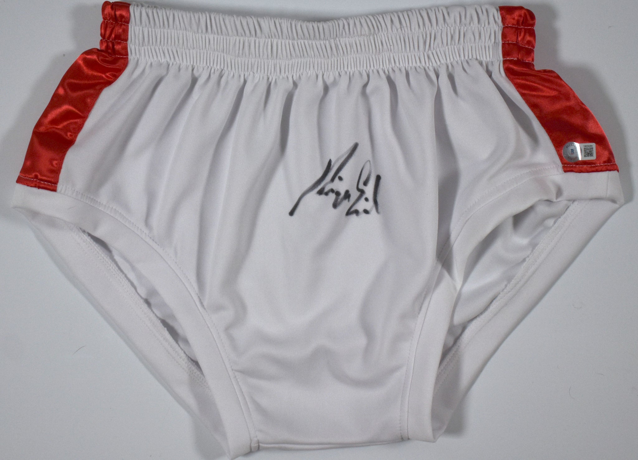 This is a hand autographed White Wrestling Trunks of Kevin Von Erich. This item has a Beckett Witnessed Authentication, which comes with a numbered hologram and a QR code for verification. You can view this item on the Beckett Authentication website. It was signed either at a public autograph appearance or a private signing. This is a stock photo of the item. Although you may not receive this exact item, the item you receive is virtually identical and brand new in great shape.
