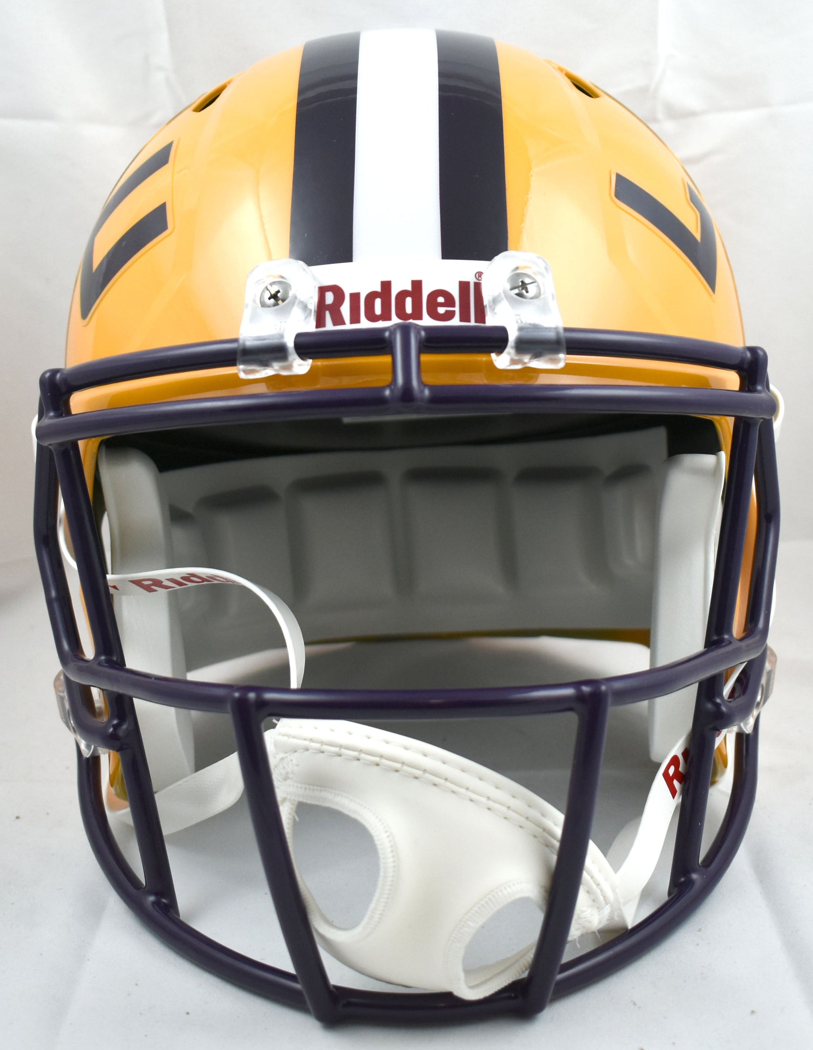This is a hand autograph of Ja' Marr Chase of the LSU Tigers on a Riddell Football Full Size Speed Replica Helmet. This item has a Beckett Witness Authentication, which comes with a numbered hologram and a QR code for verification. You can view this item on the Beckett Authentication website and it shows when and where the item was signed. It was signed either at a public autograph appearance or a private signing. This is a stock photo of the item. Although you may not receive this exact item, the item you receive is virtually identical and brand new in great shape.