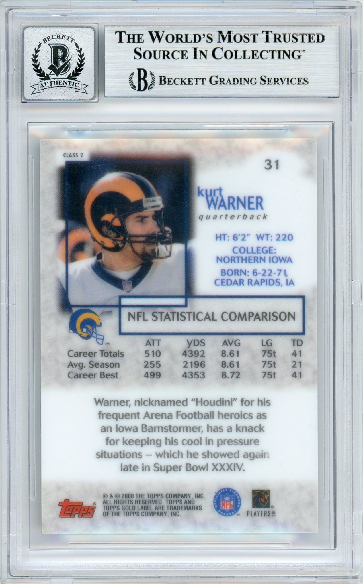 2000 Topps Gold Label Class 2 #31 Kurt Warner Rams BGS Autograph 10