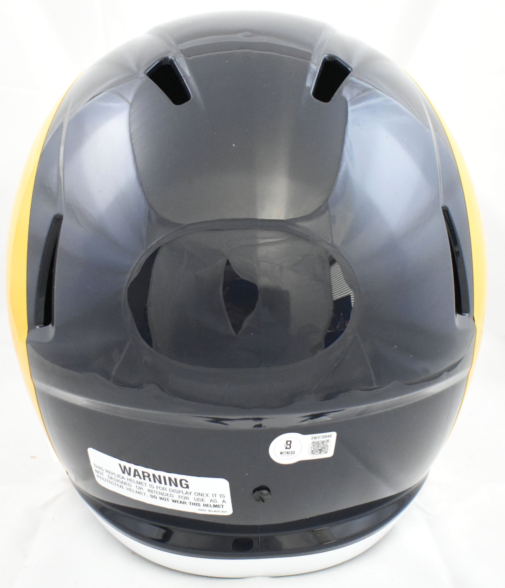 This is an Eric Dickerson of the Los Angeles Rams autographed Riddell football full size 81-99 Speed Replica helmet. This item has a Beckett Witnessed Authentication, which comes with a numbered hologram and a QR code for verification. You can view this item on the Beckett Authentication website, and it shows when and where the item was signed. It was signed either at a public autograph appearance or a private signing. This is a stock photo of the item. Although you may not receive this exact item, the item you receive is virtually identical, brand new, and in great shape. *Autograph location may vary*