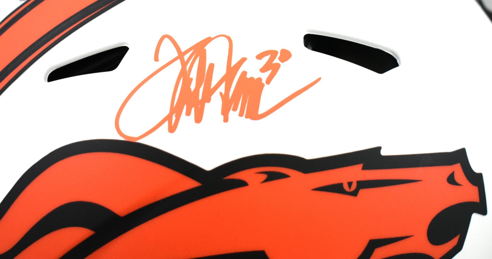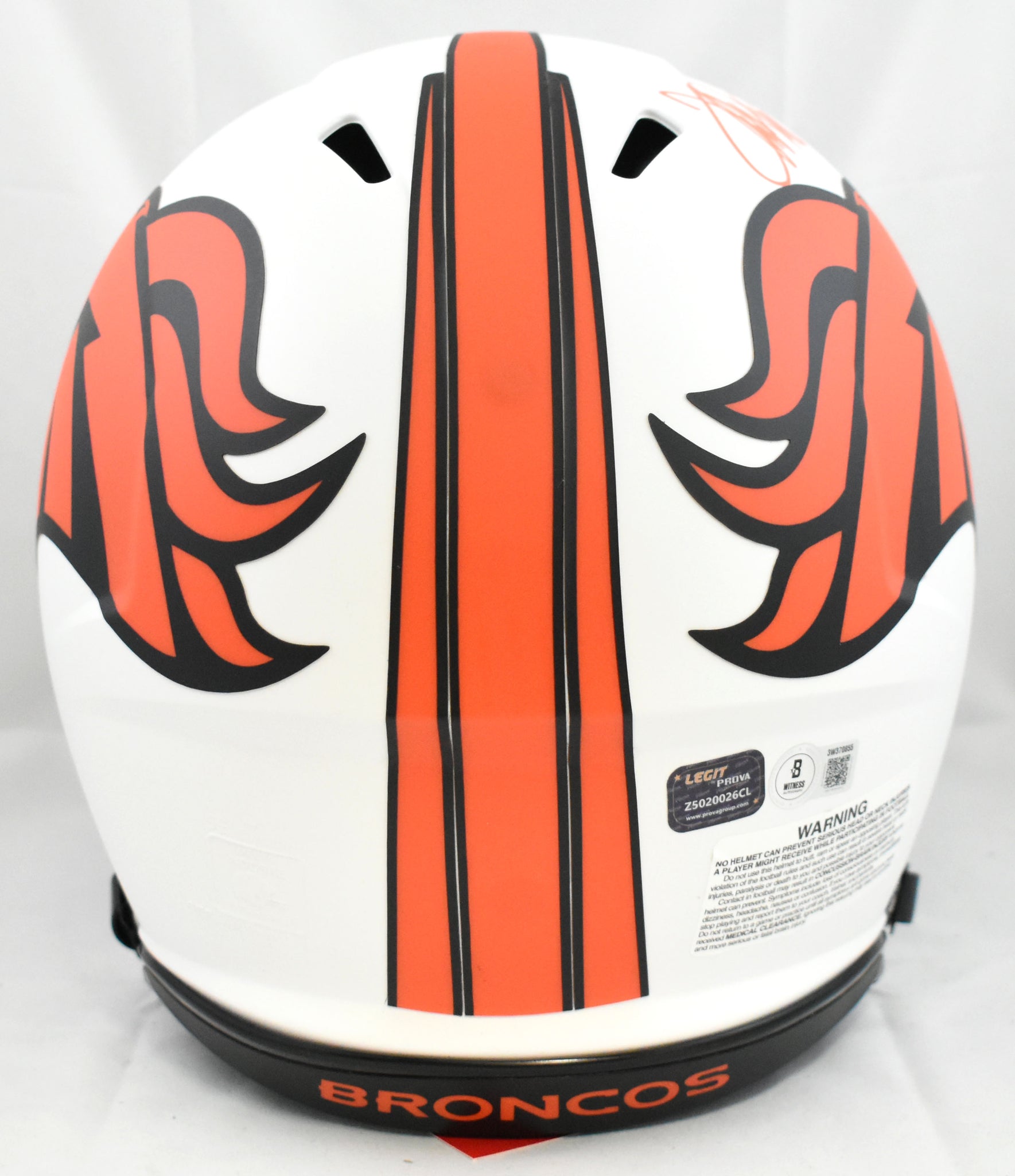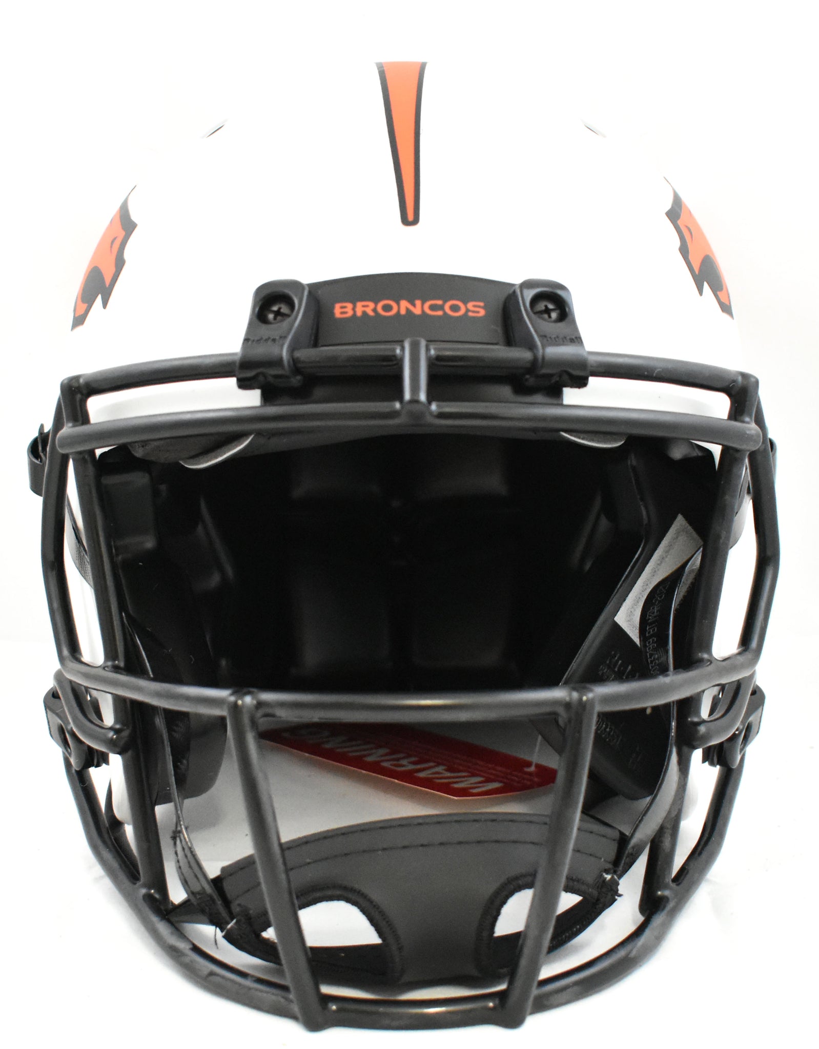 This is a Terrell Davis of the Denver Broncos autographed Riddell football full size Lunar Speed Authentic helmet. This item has a Beckett Witnessed Authentication, which comes with a numbered hologram and a QR code for verification. You can view this item on the Beckett Authentication website, and it shows when and where the item was signed. It was signed either at a public autograph appearance or a private signing. This is a stock photo of the item. Although you may not receive this exact item, the item you receive is virtually identical, brand new, and in great shape. *Autograph location may vary*