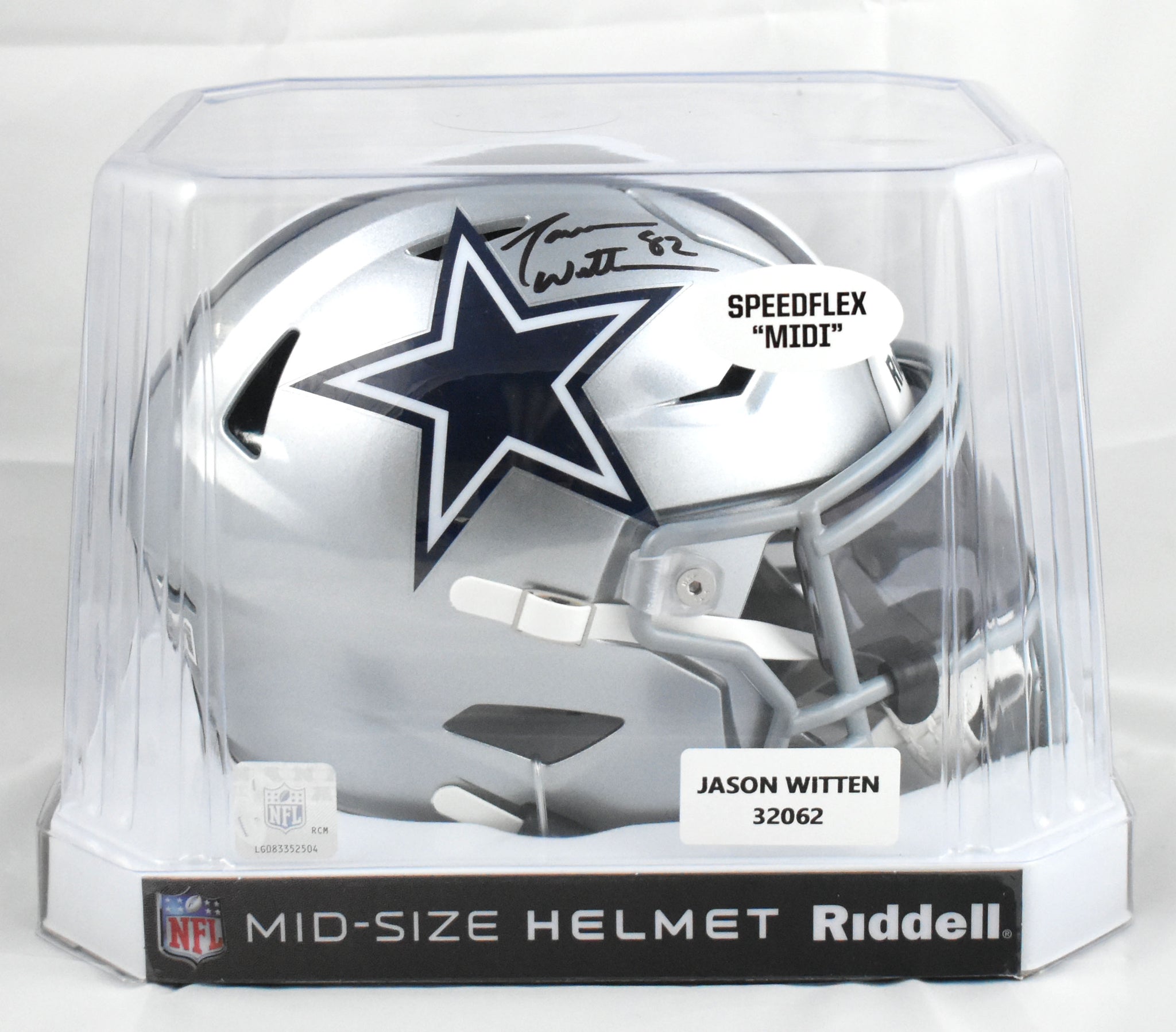 This is a Jason Witten of the Dallas Cowboys autographed Riddell football Mid-Size SpeedFlex helmet. This item has a Beckett Witnessed Authentication, which comes with a numbered hologram and a QR code for verification. You can view this item on the Beckett Authentication website, and it shows when and where the item was signed. It was signed either at a public autograph appearance or a private signing. This is a stock photo of the item. Although you may not receive this exact item, the item you receive is virtually identical, brand new, and in great shape. *Autograph location may vary*