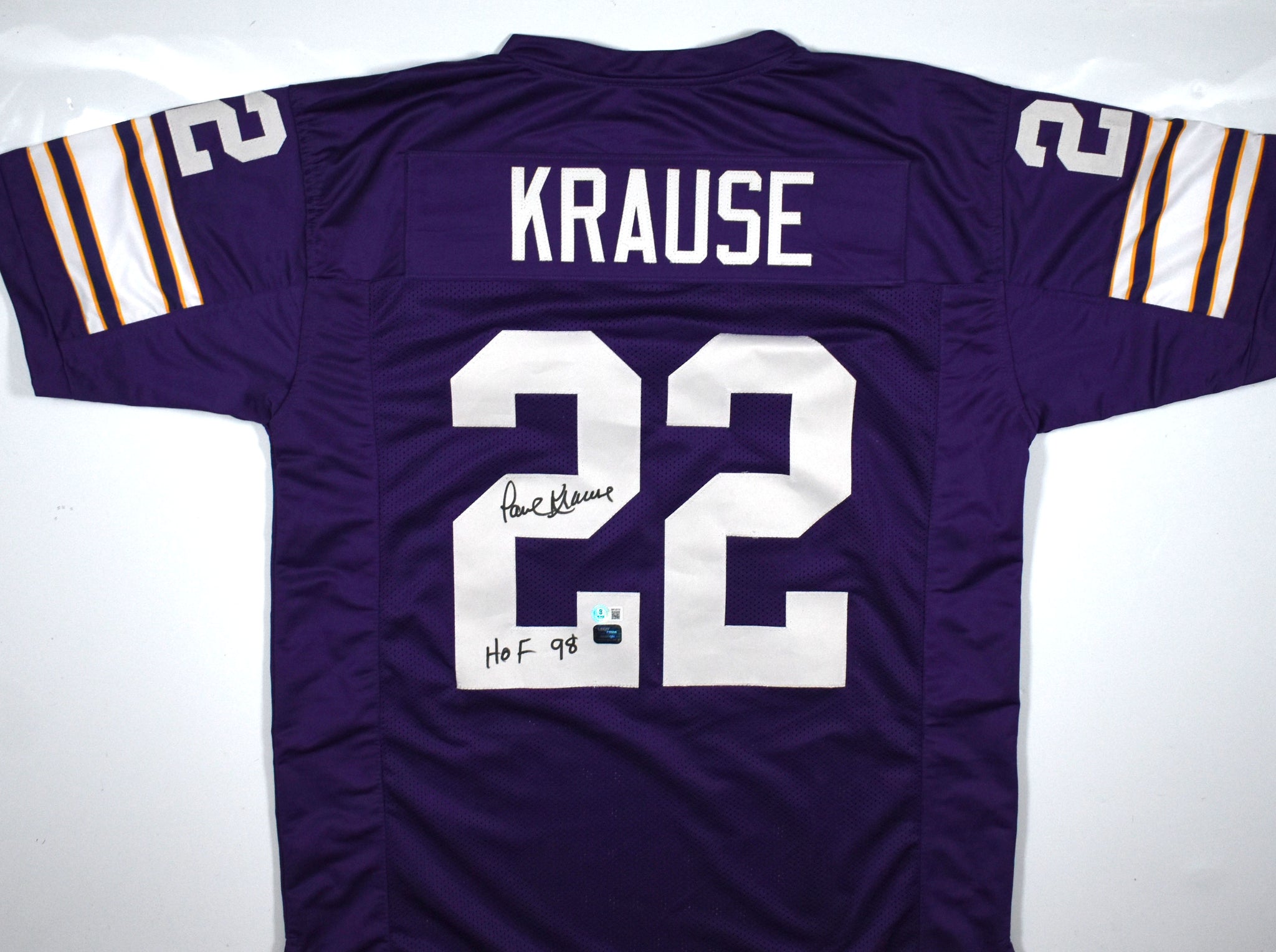 THIS IS NOT AN NFL JERSEY. THIS HAS NO TAGS, NO LOGOS, NO EMBLEMS. This is a hand autograph of Paul Krause on a Custom Made (non name brand) Authentic Style Jersey with stitched letters and numbers. Inscribed HOF. This item has a Beckett Witnessed Authentication, which comes with a Beckett numbered sticker hologram and a QR Code for verification. You can view this item on the Beckett Authentication website and it shows when and where the item was signed. It was signed either at a public autograph appearance or a private signing. This is a stock photo of the item. Although you may not receive this exact item, the item you receive is virtually identical and brand new in great shape. Jersey size is XL.