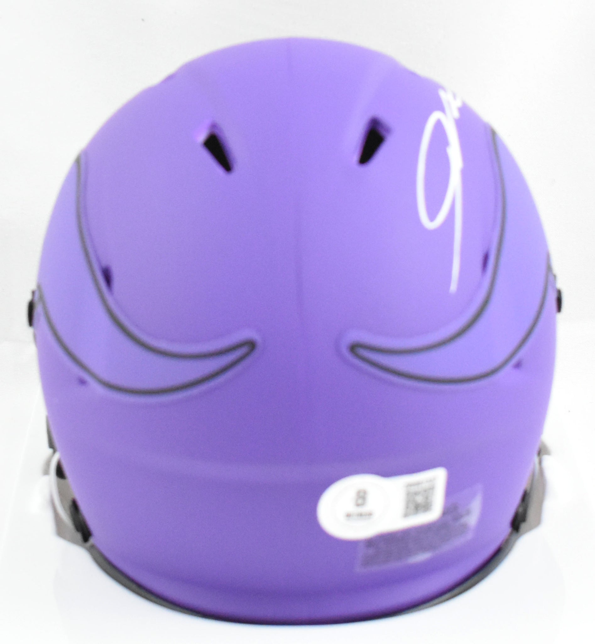 This is a hand autograph of Jordan Addison of the Minnesota Vikings on a Riddell Football Rave Speed Mini Helmet. This item has a Beckett Witnessed Authentication, which comes with a numbered hologram and a QR code for verification. You can view this item on the Beckett Authentication website and it shows when and where the item was signed. It was signed either at a public autograph appearance or a private signing. This is a stock photo of the item. Although you may not receive this exact item, the item you receive is virtually identical and brand new in great shape.
