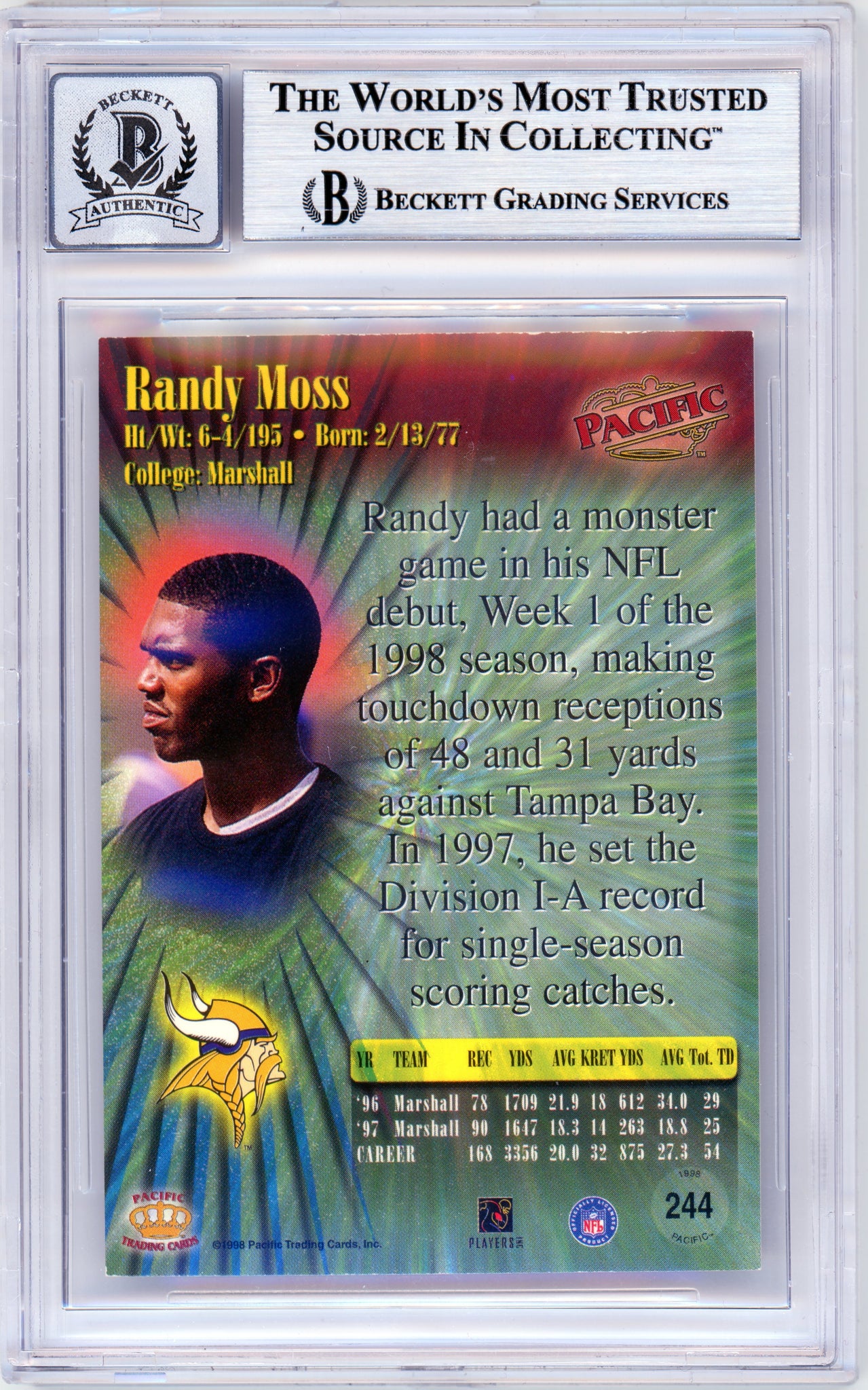 1998 Pacific #244 Randy Moss RC Vikings BGS Autograph 10, hand signed by Randy Moss who played for the Minnesota Vikings. This card was graded and authenticated by Beckett Grading Services. (BGS) Please visit the Beckett website and enter the authentication # for more information about this item. We appreciate your interest in our items, and we hope to provide you with a smooth and professional transaction.