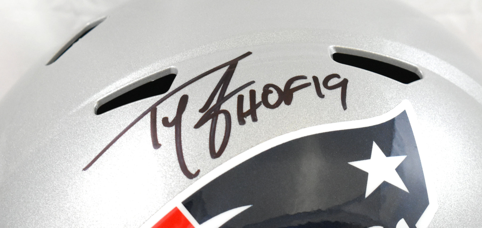 This is a Ty Law of the New England Patriots autographed Riddell football full size Speed Replica helmet. Inscribed HOF. This item has a Beckett Witnessed Authentication, which comes with a numbered hologram and a QR code for verification. You can view this item on the Beckett Authentication website, and it shows when and where the item was signed. It was signed either at a public autograph appearance or a private signing. This is a stock photo of the item. Although you may not receive this exact item, the item you receive is virtually identical, brand new, and in great shape. *Autograph location may vary*