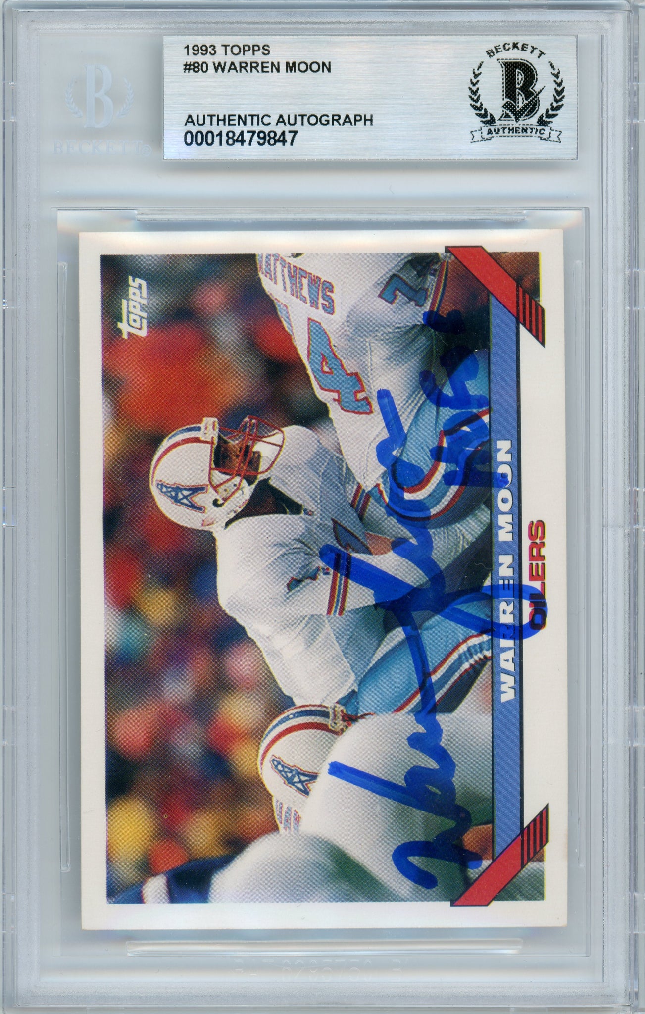 1993 Topps #80 Warren Moon w/ "HOF" Houston Oilers BGS Autograph sports trading card, hand signed by Warren Moon and graded by Beckett Grading Services. (BGS) We appreciate your interest in our items, and we hope that we can make all transactions professional and satisfying.