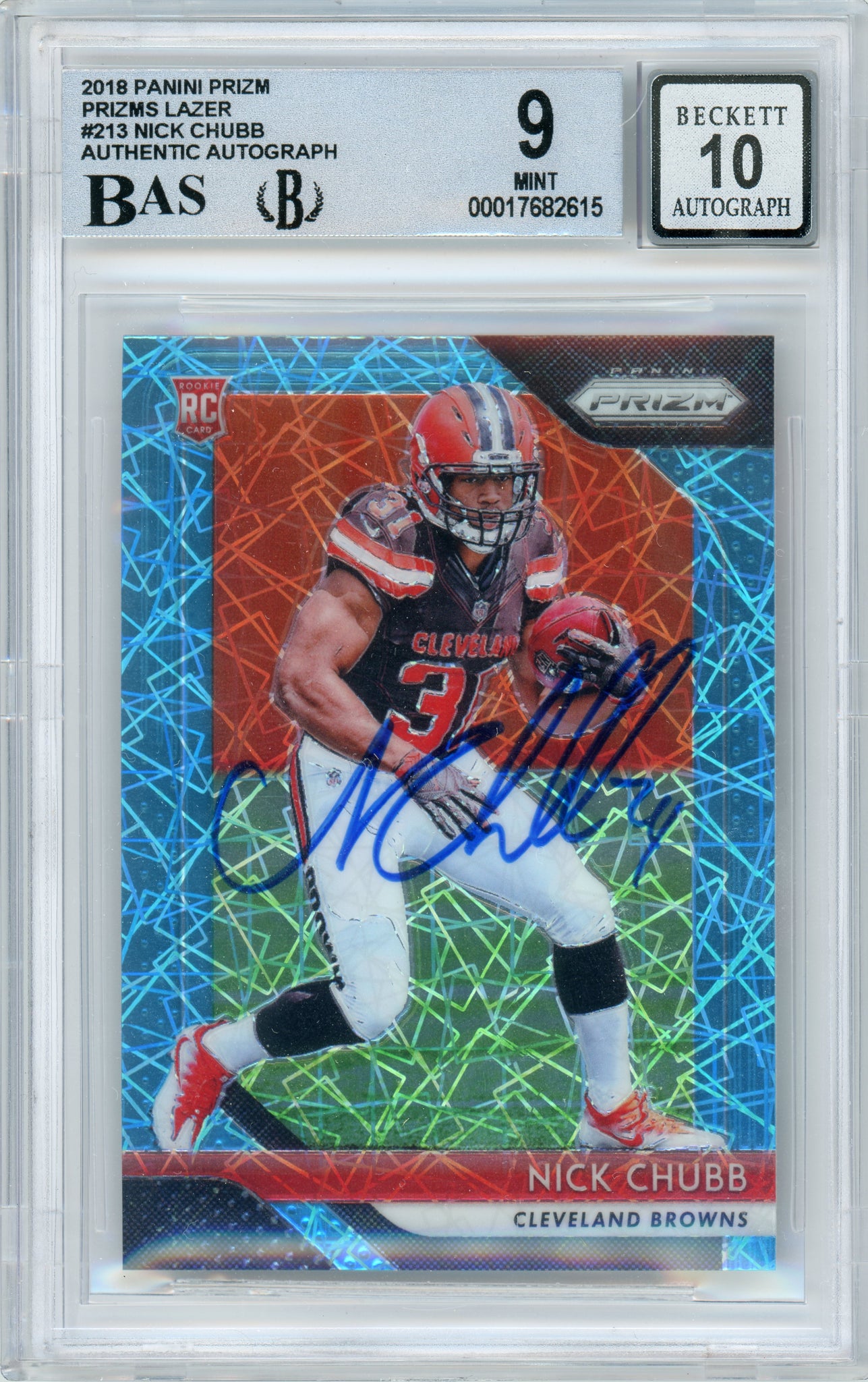 2018 Panini Prizm Blue Lazer #213 Nick Chubb RC Browns BGS 9 Autograph 10 sports trading card, hand signed by Nick Chubb and graded by Beckett Grading Services. (BGS) We appreciate your interest in our items, and we hope that we can make all transactions professional and satisfying.