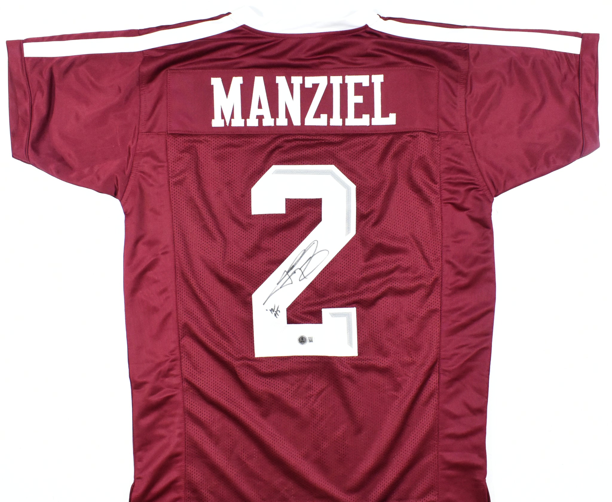 THIS IS NOT AN NCAA JERSEY. THIS HAS NO TAGS, NO LOGOS, NO EMBLEMS. This is a hand autograph of Johnny Manziel on a Custom Made (non name brand) Authentic Style Jersey with stitched letters and numbers. Inscribed '12 Heisman. This item has a Beckett Witnessed Authentication, which comes with a numbered hologram and a QR code for verification. You can view this item on the Beckett Authentication website and it shows when and where the item was signed. It was signed either at a public autograph appearance or a private signing. This is a stock photo of the item. Although you may not receive this exact item, the item you receive is virtually identical and brand new in great shape. Jersey size is XL.