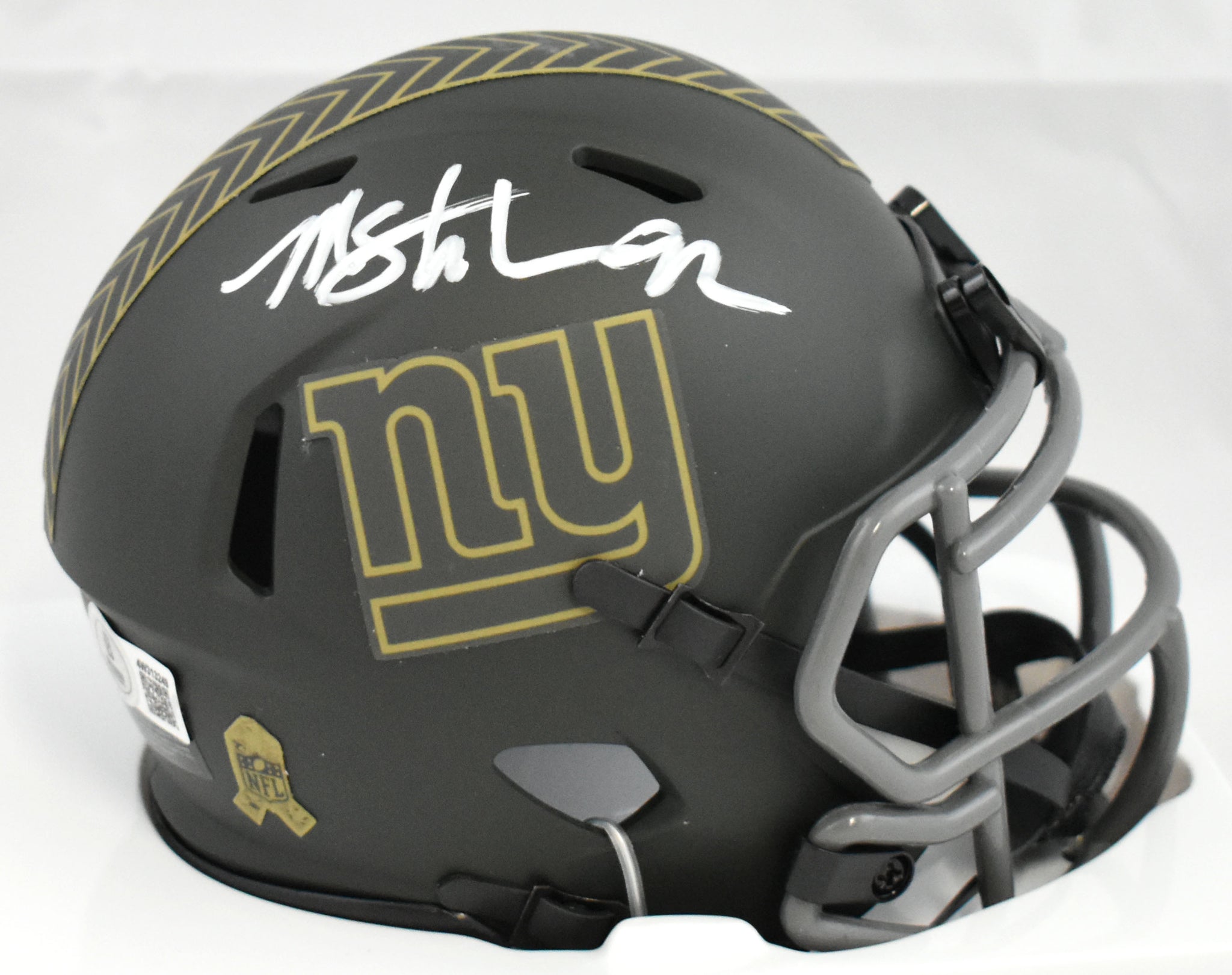 This is a hand autograph of Michael Strahan of the New York Giants on a Riddell Salute to Service 2025 Speed Mini Helmet. This item has a Beckett Witnessed Authentication, which comes with a numbered hologram and a QR code for verification. You can view this item on the Beckett Authentication website, and it shows when and where the item was signed. It was signed either at a public autograph appearance or a private signing. This is a stock photo of the item. Although you may not receive this exact item, the item you receive is virtually identical and brand new in great shape.