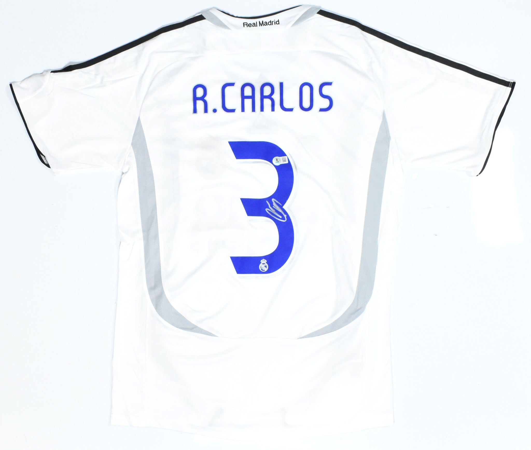 This is a hand autograph Adidas Jersey of Roberto Carlos of Real Madrid. This item has a Beckett Witnessed Authentication, which comes with a Beckett numbered sticker hologram and a QR Code for verification. You can view this item on the Beckett Authentication website. It was signed either at a public autograph appearance or a private signing. This is a stock photo of the item. Although you may not receive this exact item, the item you receive is virtually identical and brand new in great shape. Jersey size is M.