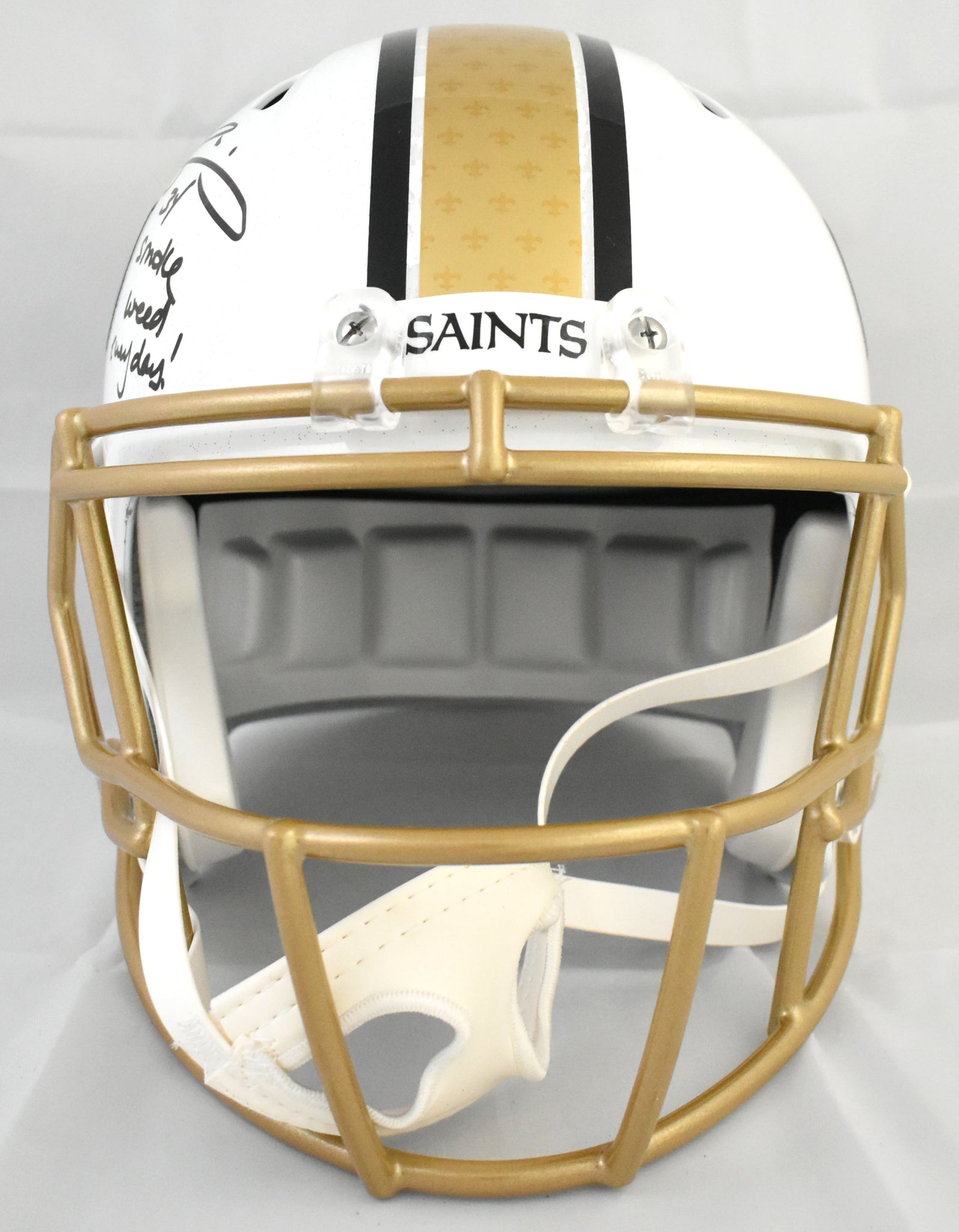 This is a Ricky Williams of the New Orleans Saints autographed Riddell football full size Alternate 2025 Speed Replica helmet. Inscribed Smoke Weed Everyday. This item has a Beckett Witnessed Authentication, which comes with a numbered hologram and a QR code for verification. You can view this item on the Beckett Authentication website, and it shows when and where the item was signed. It was signed either at a public autograph appearance or a private signing. This is a stock photo of the item. Although you may not receive this exact item, the item you receive is virtually identical, brand new, and in great shape. *Autograph location may vary*