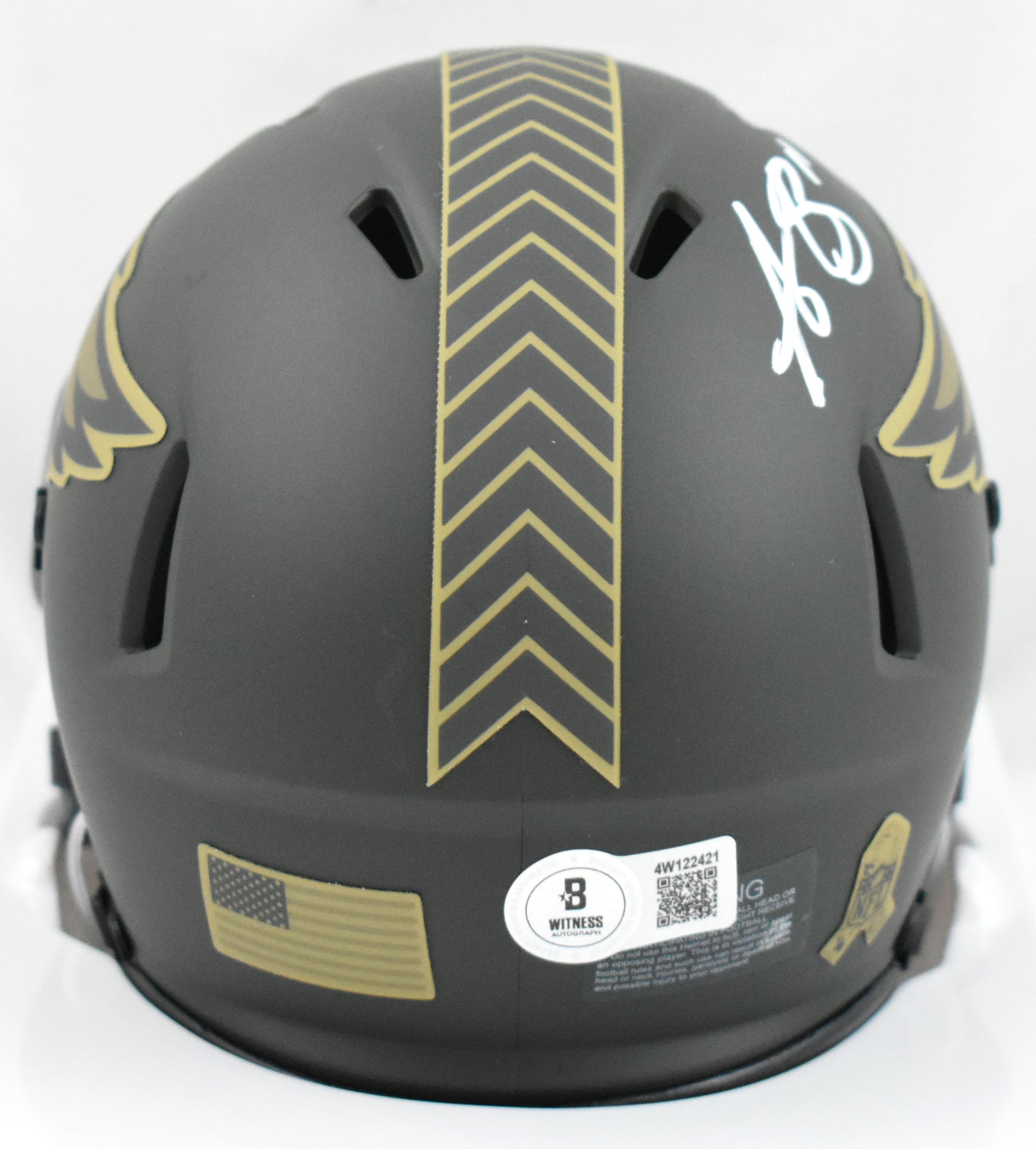 This is a hand autograph of AJ Brown of the Philadelphia Eagles on a Riddell Football Salute to Service 2025 Speed Mini Helmet. This item has a Beckett Witnessed Authentication, which comes with a numbered hologram and a QR code for verification. You can view this item on the Beckett Authentication website, and it shows when and where the item was signed. It was signed either at a public autograph appearance or a private signing. This is a stock photo of the item. Although you may not receive this exact item, the item you receive is virtually identical and brand new in great shape.