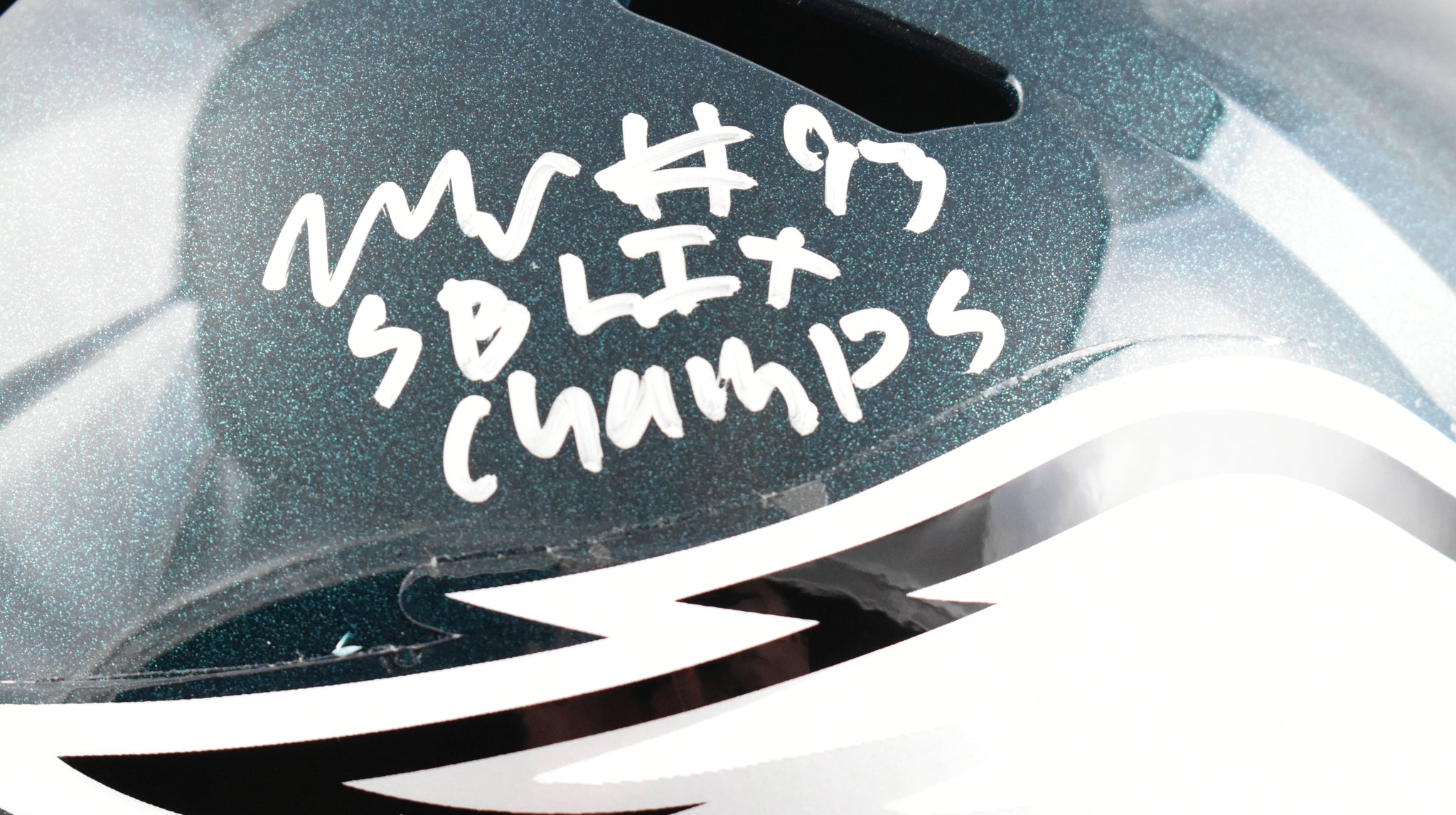 This is a Milton Williams of the Philadelphia Eagles Autographed Riddell football full size Speed Replica helmet. Inscribed SB Champs. This item has a Beckett Witnessed Authentication, which comes with a numbered hologram and a QR code for verification. You can view this item on the Beckett Authentication website and it shows when and where the item was signed. It was signed either at a public autograph appearance or a private signing. This is a stock photo of the item. Although you may not receive this exact item, the item you receive is virtually identical, brand new, and in great shape. *Autograph location may vary*