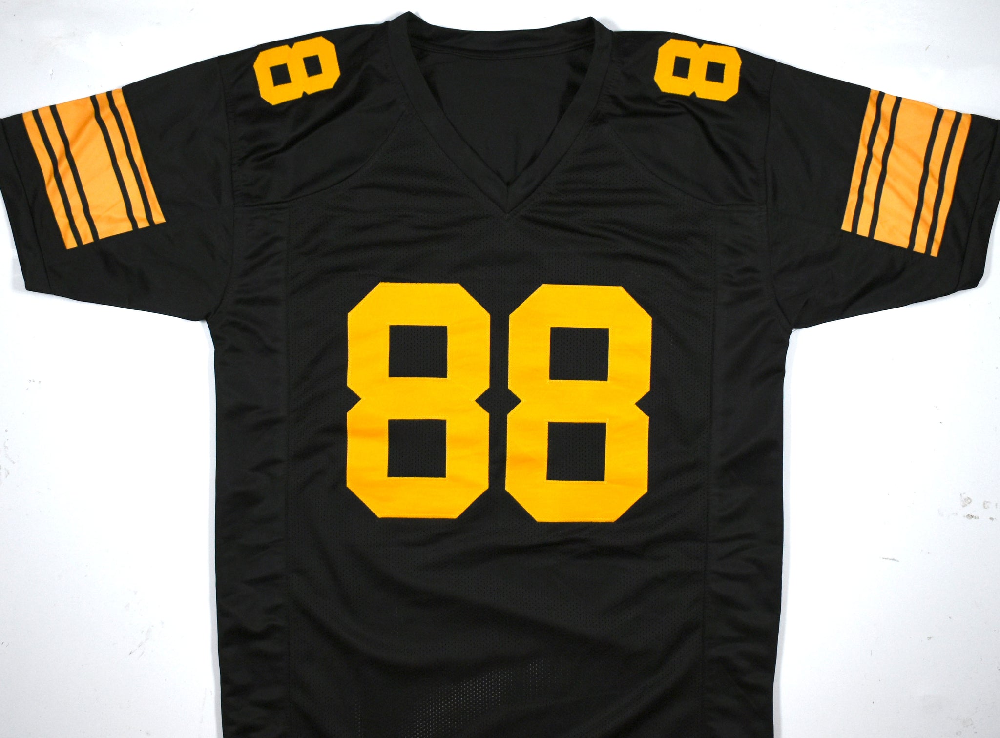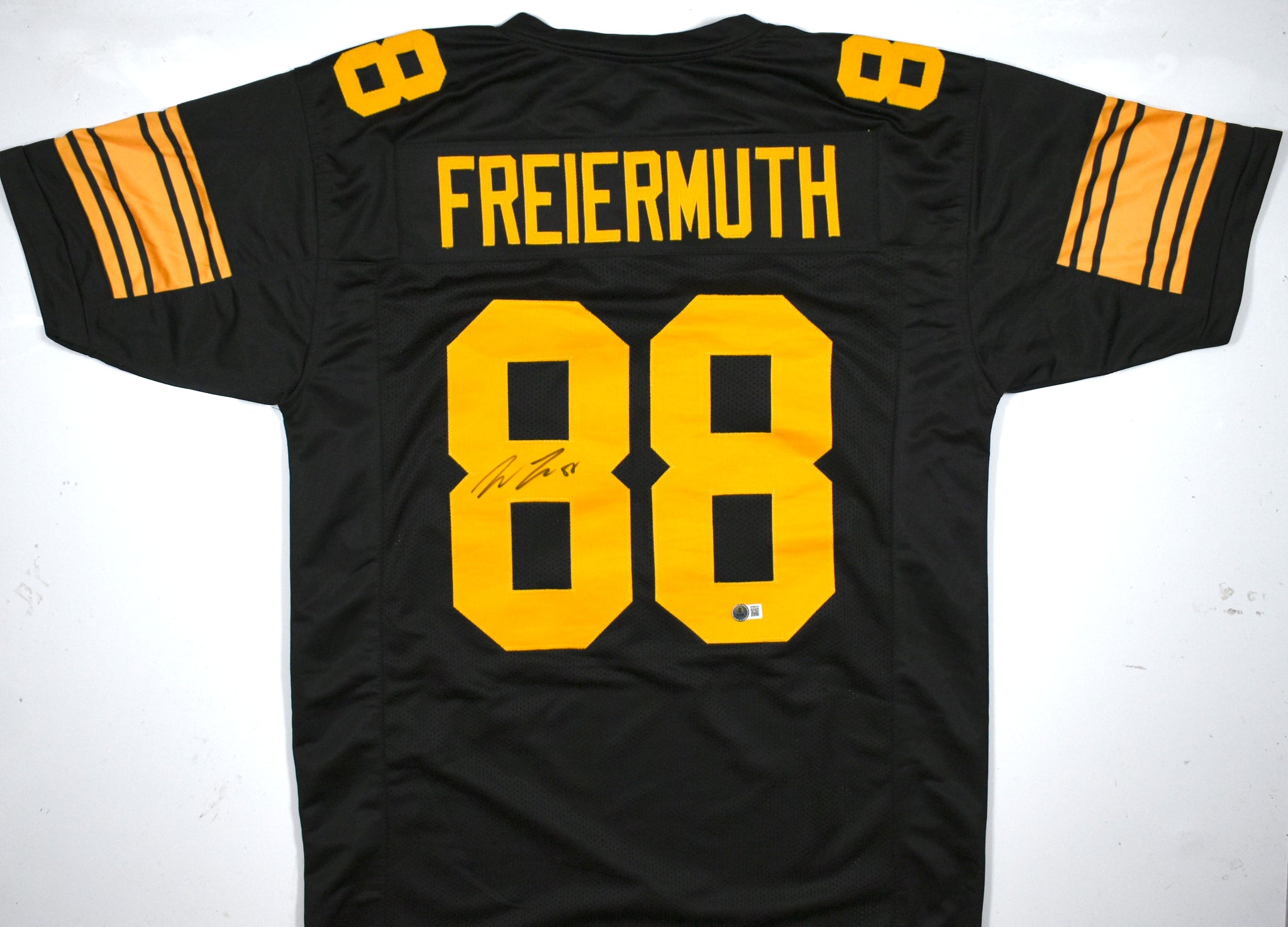 THIS IS NOT AN NFL JERSEY. THIS HAS NO TAGS, NO LOGOS, NO EMBLEMS. This is a Hand Autograph of Pat Freiermuth on a custom made (Non Name Brand) authentic style jersey with stitched letters and numbers. This item has a Beckett Witnessed Authentication, which comes with a Beckett #'ed hologram and a QR code for verification. You can view this item on the Beckett website and it shows when and where the item was signed. It was signed either at a public autograph appearance or a private signing. This is a stock photo of the item. Although you may not receive this exact item, the item you receive is virtually identical and brand new in great shape. Jersey size is XL.