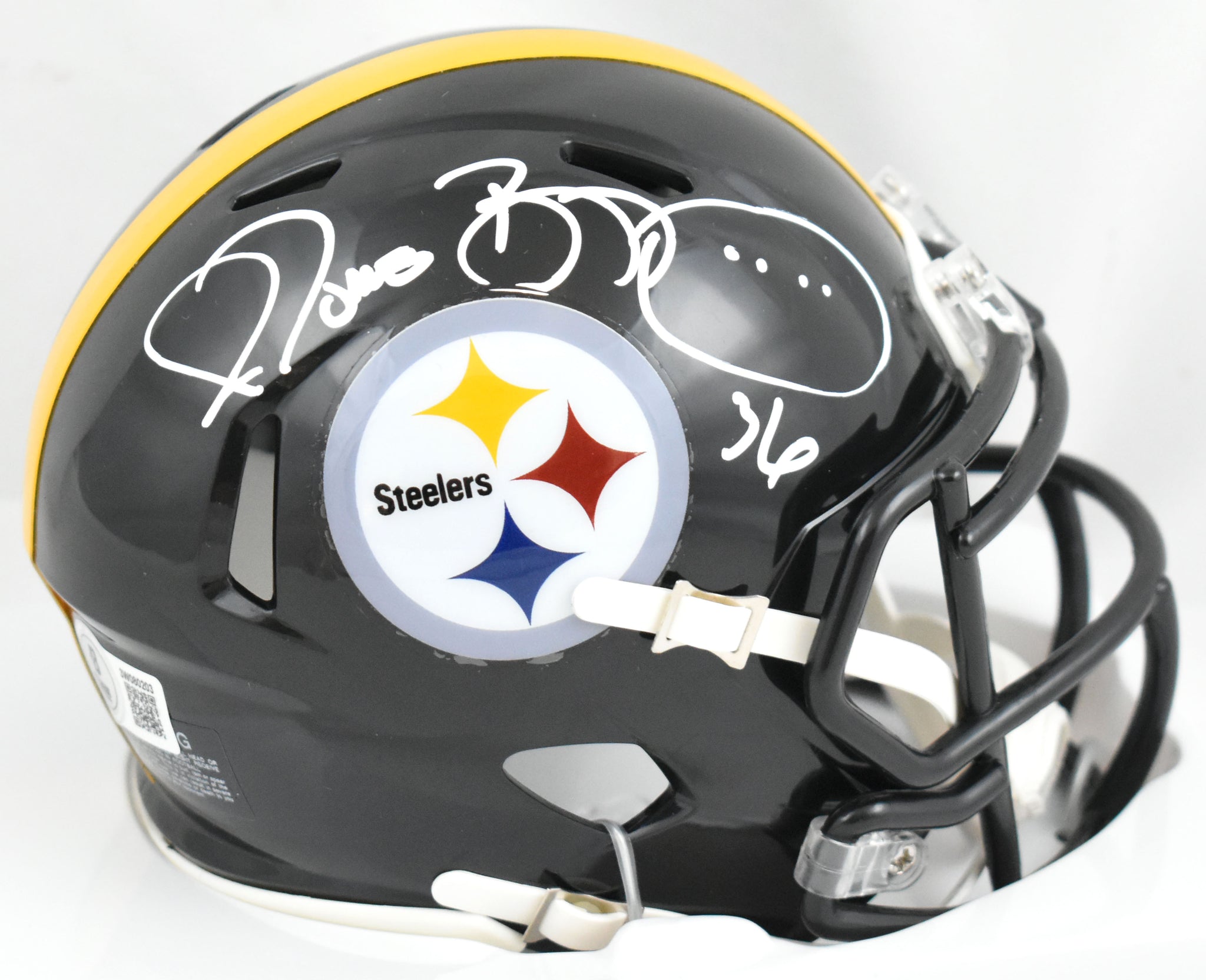 This is a hand autograph of Jerome Bettis of the Pittsburgh Steelers on a Riddell Football Speed Mini Helmet. This item has a Beckett Witnessed Authentication, which comes with a numbered hologram and a QR code for verification. You can view this item on the Beckett Authentication website, and it shows when and where the item was signed. It was signed either at a public autograph appearance or a private signing. This is a stock photo of the item. Although you may not receive this exact item, the item you receive is virtually identical and brand new in great shape.