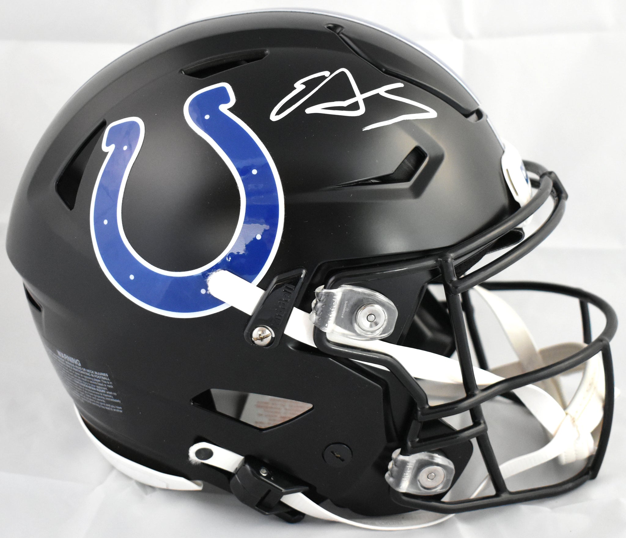 This is a Edgerrin James of the Indianapolis Colts Autographed Riddell football full size Alternate SpeedFlex Authentic helmet. This item has a Beckett Witnessed Authentication, which comes with a numbered hologram and a QR code for verification. You can view this item on the Beckett Authentication website, and it shows when and where the item was signed. It was signed either at a public autograph appearance or a private signing. This is a stock photo of the item. Although you may not receive this exact item, the item you receive is virtually identical, brand new, and in great shape. *Autograph location may vary*