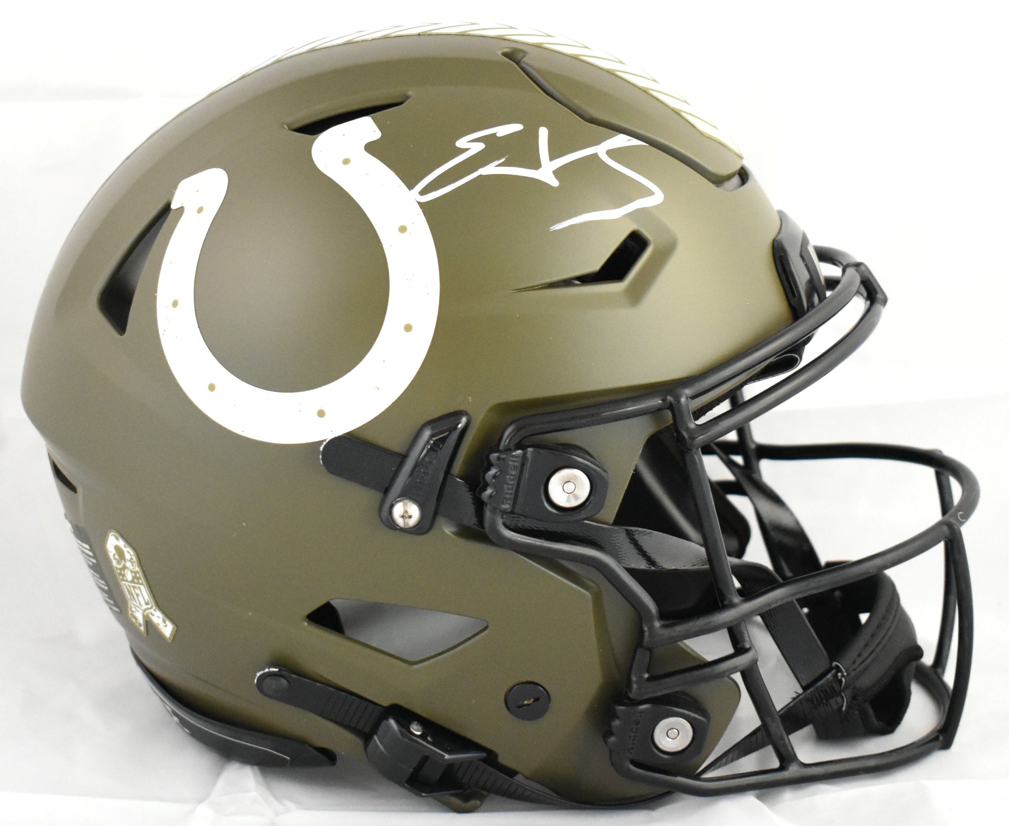 This is a Edgerrin James of the Indianapolis Colts Autographed Riddell football full size Salute to Service SpeedFlex Authentic helmet. This item has a Beckett Witnessed Authentication, which comes with a numbered hologram and a QR code for verification. You can view this item on the Beckett Authentication website, and it shows when and where the item was signed. It was signed either at a public autograph appearance or a private signing. This is a stock photo of the item. Although you may not receive this exact item, the item you receive is virtually identical, brand new, and in great shape. *Autograph location may vary*