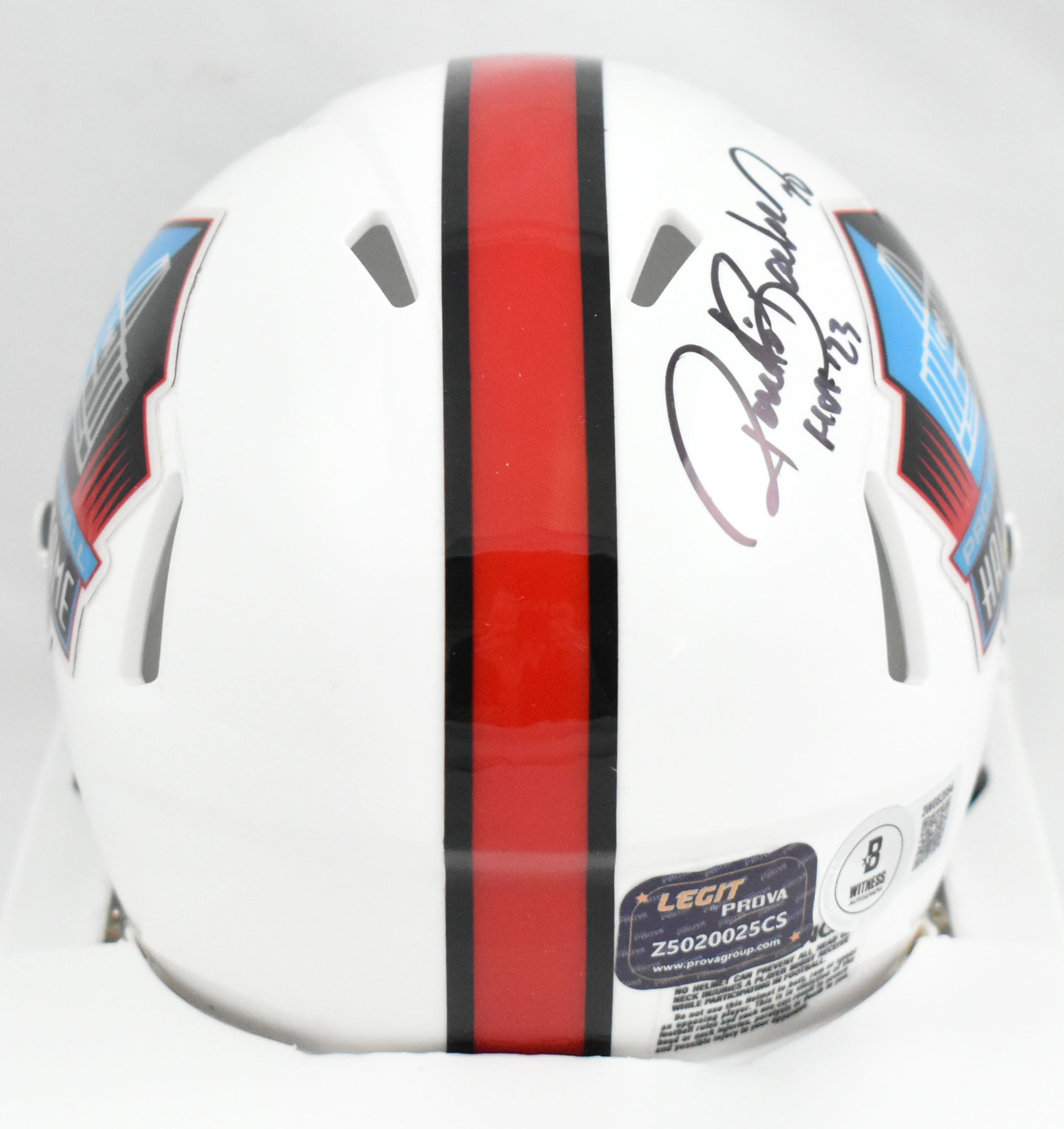 This is a hand autograph of Ronde Barber of the Tampa Bay Buccaneers on a Riddell Football Hall of Fame Speed Mini Helmet. Inscribed HOF. This item has a Beckett Witnessed Authentication, which comes with a numbered hologram and a QR code for verification. You can view this item on the Beckett Authentication website, and it shows when and where the item was signed. It was signed either at a public autograph appearance or a private signing. This is a stock photo of the item. Although you may not receive this exact item, the item you receive is virtually identical and brand new in great shape.