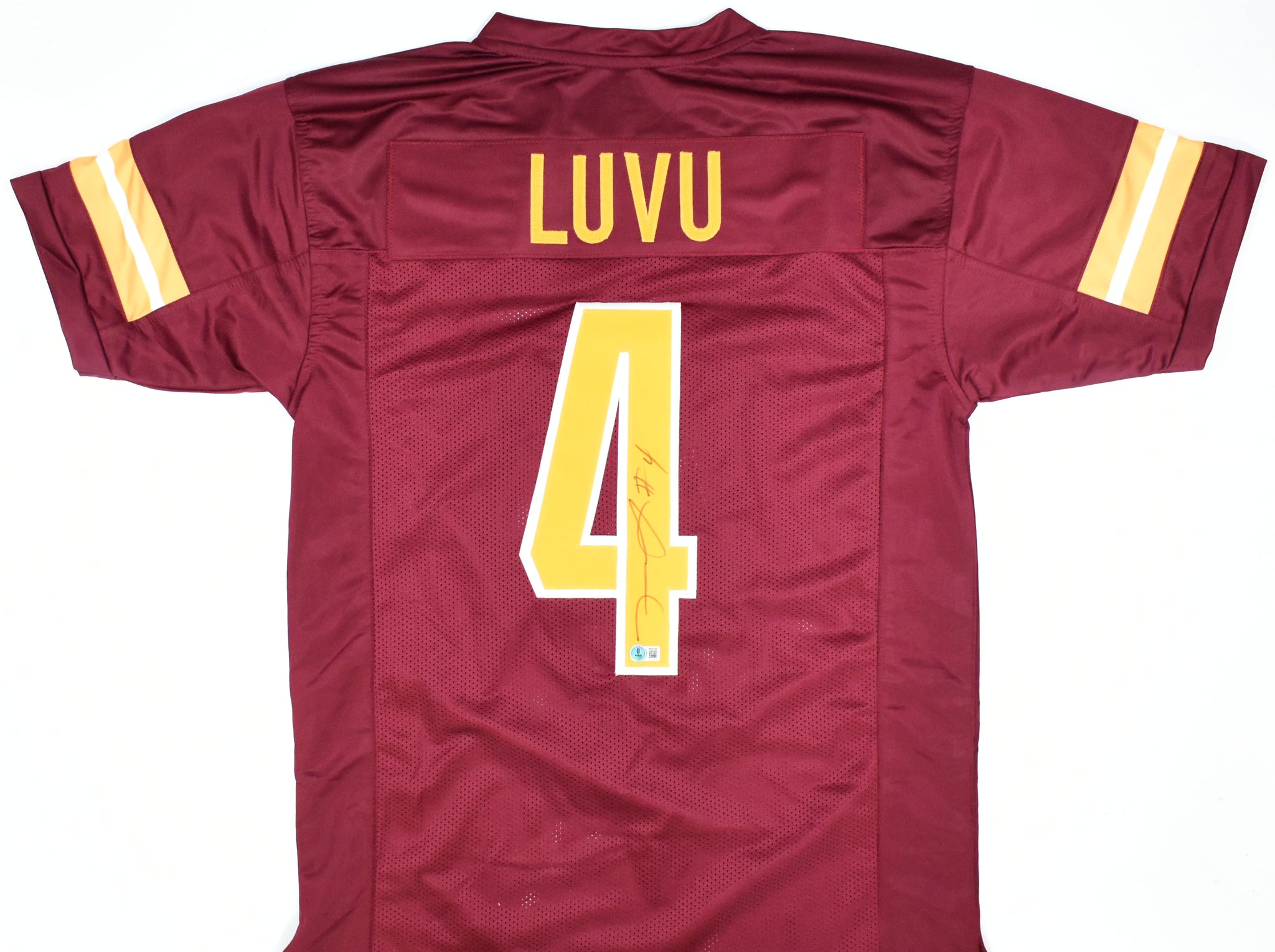 THIS IS NOT AN NFL JERSEY. THIS HAS NO TAGS, NO LOGOS, NO EMBLEMS. This is a hand autograph of Frankie Luvu of the Washington Commanders on a Custom Made (non-name brand) Authentic Style Jersey with stitched letters and numbers. This item has a Beckett Witnessed Authentication, which comes with a Beckett numbered sticker hologram and a QR Code for verification. You can view this item on the Beckett Authentication website. It was signed either at a public autograph appearance or a private signing. This is a stock photo of the item. Although you may not receive this exact item, the item you receive is virtually identical and brand new in great shape. Jersey size is XL.