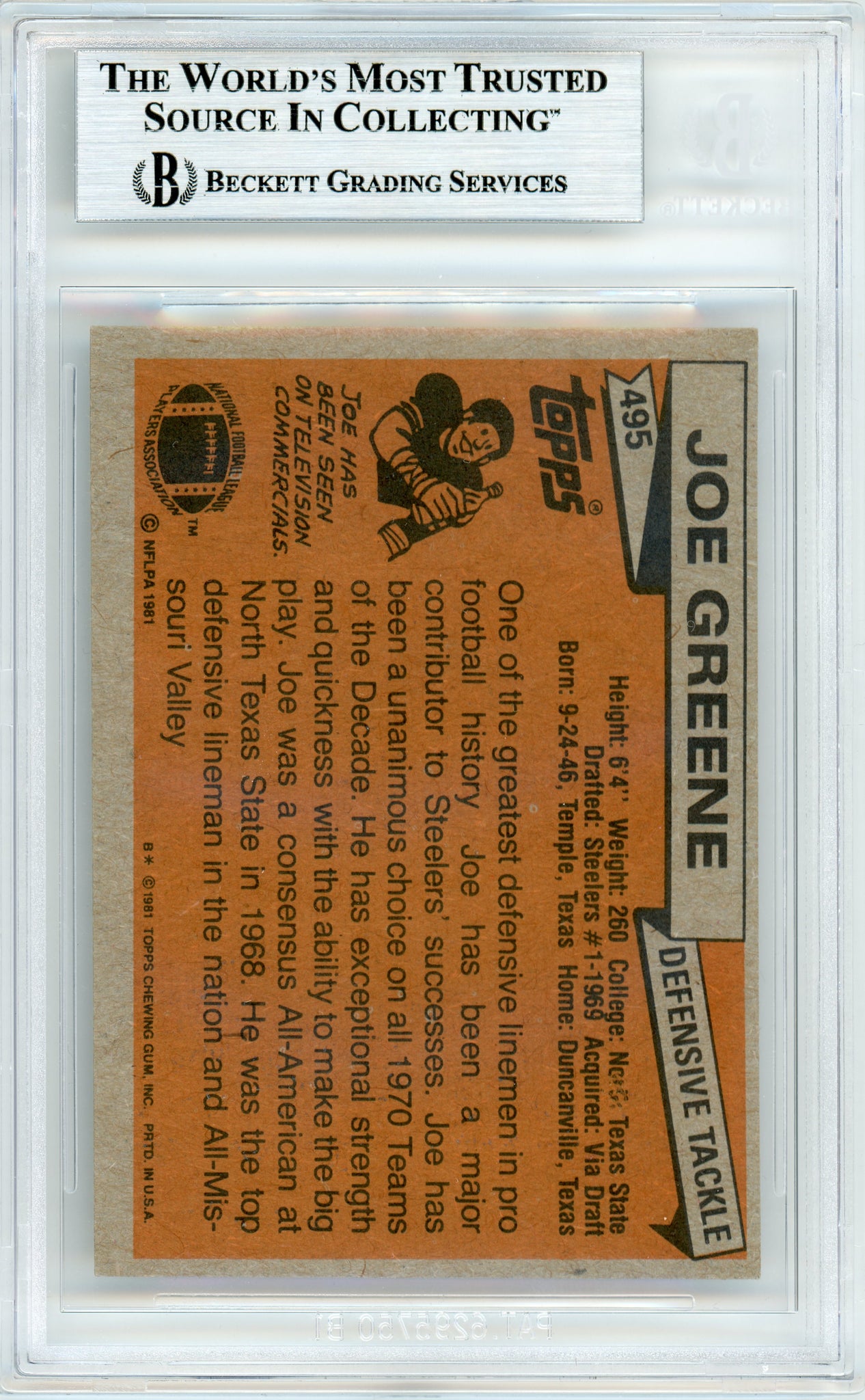 1981 Topps #465 Joe Greene Pittsburgh Steelers BGS Autograph sports trading card, hand signed by Joe Greene of the Pittsburgh Steelers. This item is graded by Beckett Grading Services. (BGS) Visit the Beckett website and enter the certification code provided on slab for more information about this item. We appreciate your interest in our items, and we hope to provide you with a smooth and professional transaction.