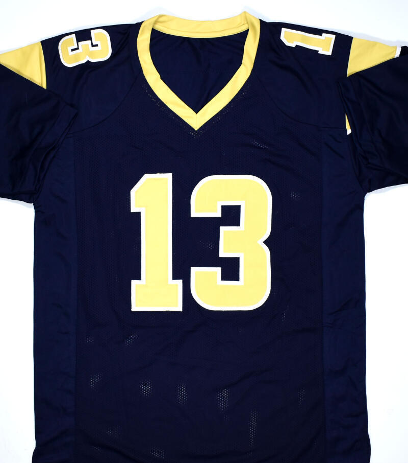 THIS IS NOT AN NFL JERSEY. THIS HAS NO TAGS, NO LOGOS, NO EMBLEMS. This is a Kurt Warner of the St. Louis Rams hand autographed custom made (non name brand) authentic style (stitched letters and numbers) jersey. Inscribed SB MVP. This item has a Beckett Witnessed Authentication, which comes with a numbered hologram and a QR code for verification. You can view this item on the Beckett Authentication website, it shows when and where the item was signed. It was signed either at a public autograph appearance or a private signing. This is a stock photo of the item. Although you may not receive this exact item, the item you receive is virtually identical, brand new, and in great shape. Jersey size is XL.