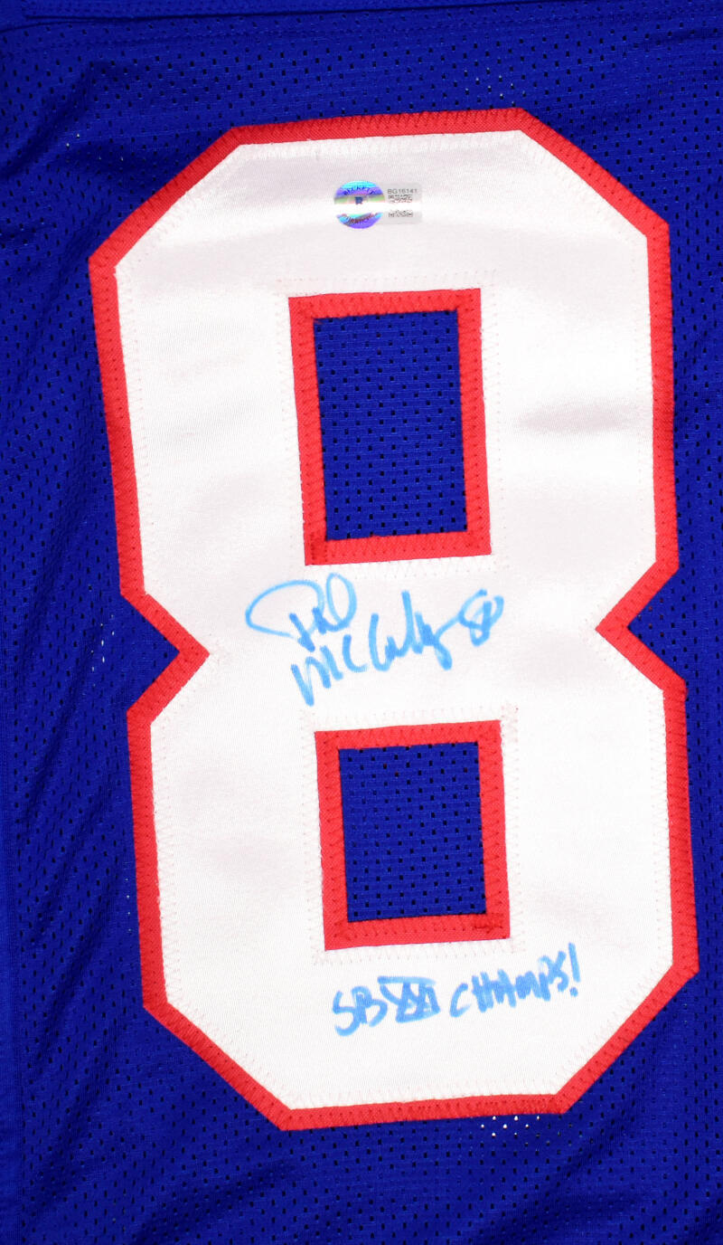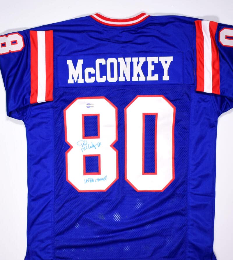 THIS IS NOT AN NFL JERSEY. THIS HAS NO TAGS, NO LOGOS, NO EMBLEMS. This is a Hand Autograph of Phil McConkey on a custom made (Non Name Brand) authentic style (Stitched Letters and Numbers) jersey. Inscribed SB Champs. This item has a Beckett Authentication, which comes with a Beckett #'ed and a QR code for verification. You can view this item on the Beckett website. It was signed either at a public autograph appearance or a private signing. This is a stock photo of the item. Although you may not receive this exact item, the item you receive is virtually identical and brand new in great shape. Jersey Size is XL.