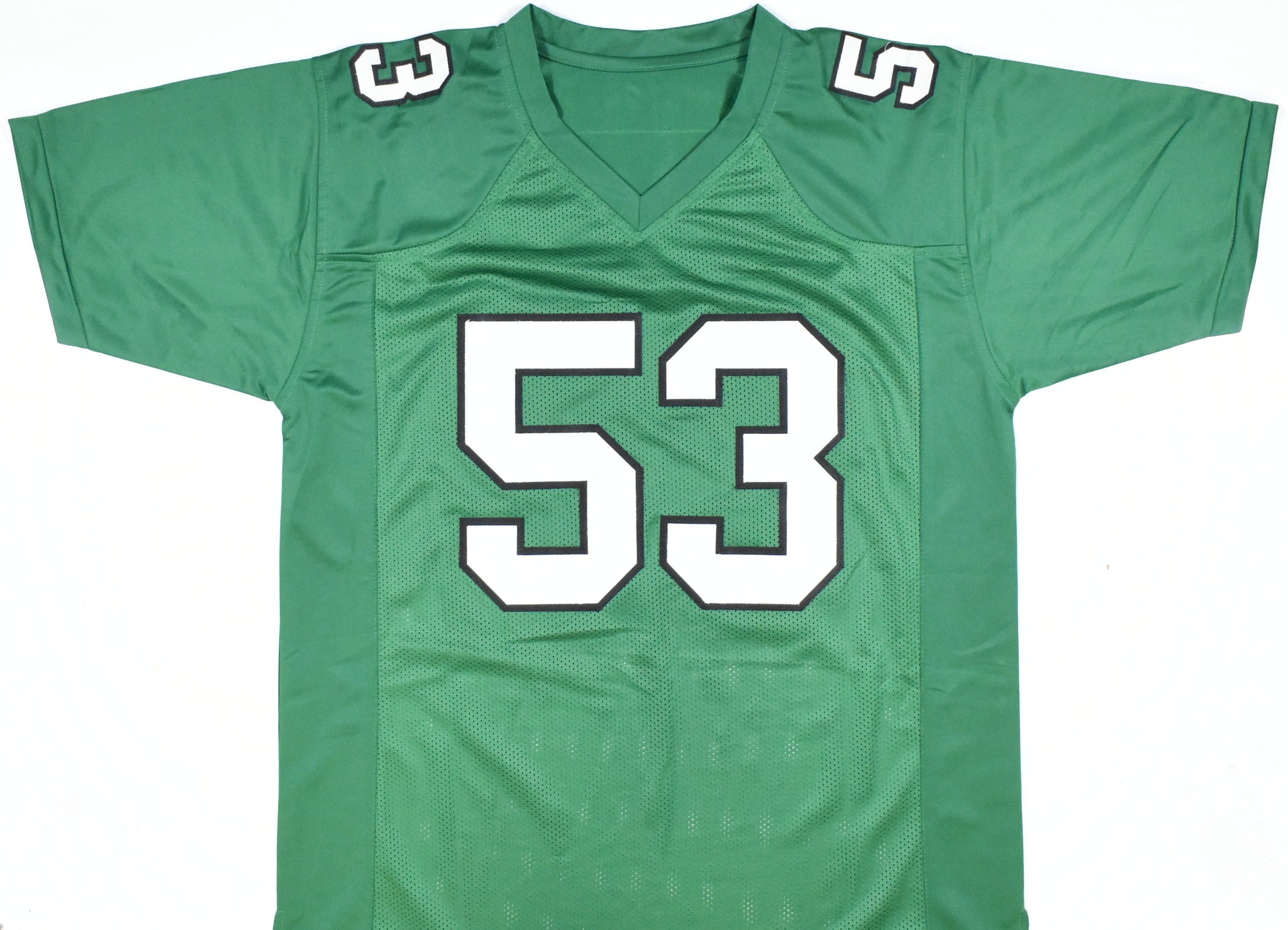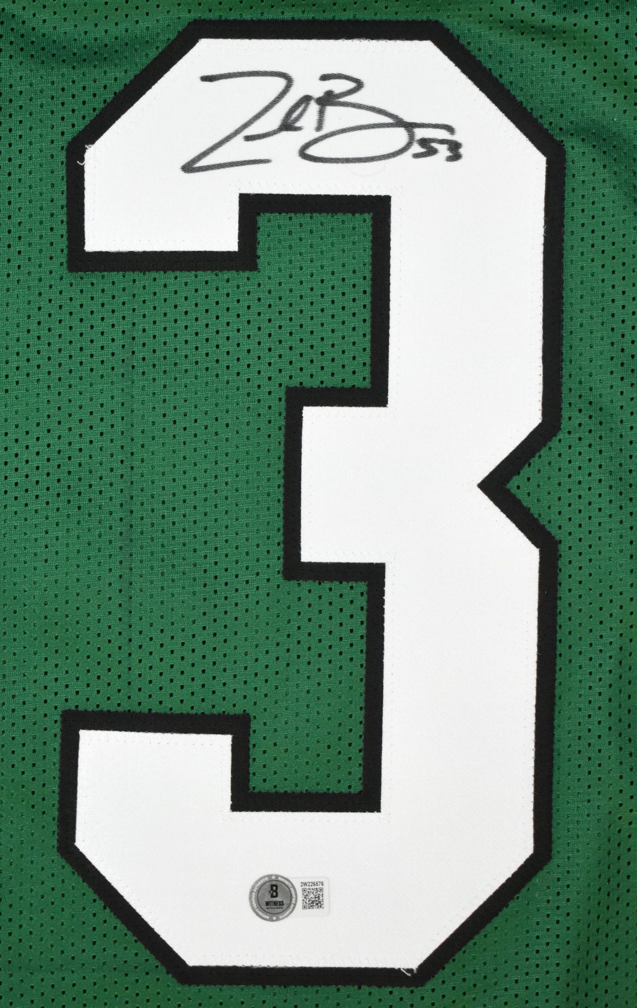 THIS IS NOT AN NFL JERSEY. THIS HAS NO TAGS, NO LOGOS, NO EMBLEMS. This is a hand autograph of Zack Baun of the Philadelphia Eagles on a Custom Made (non-name brand) Authentic Style Jersey with stitched letters and numbers. This item has a Beckett Witnessed Authentication, which comes with a Beckett numbered sticker hologram and a QR Code for verification. You can view this item on the Beckett Authentication website. It was signed either at a public autograph appearance or a private signing. This is a stock photo of the item. Although you may not receive this exact item, the item you receive is virtually identical and brand new in great shape. Jersey size is XL.